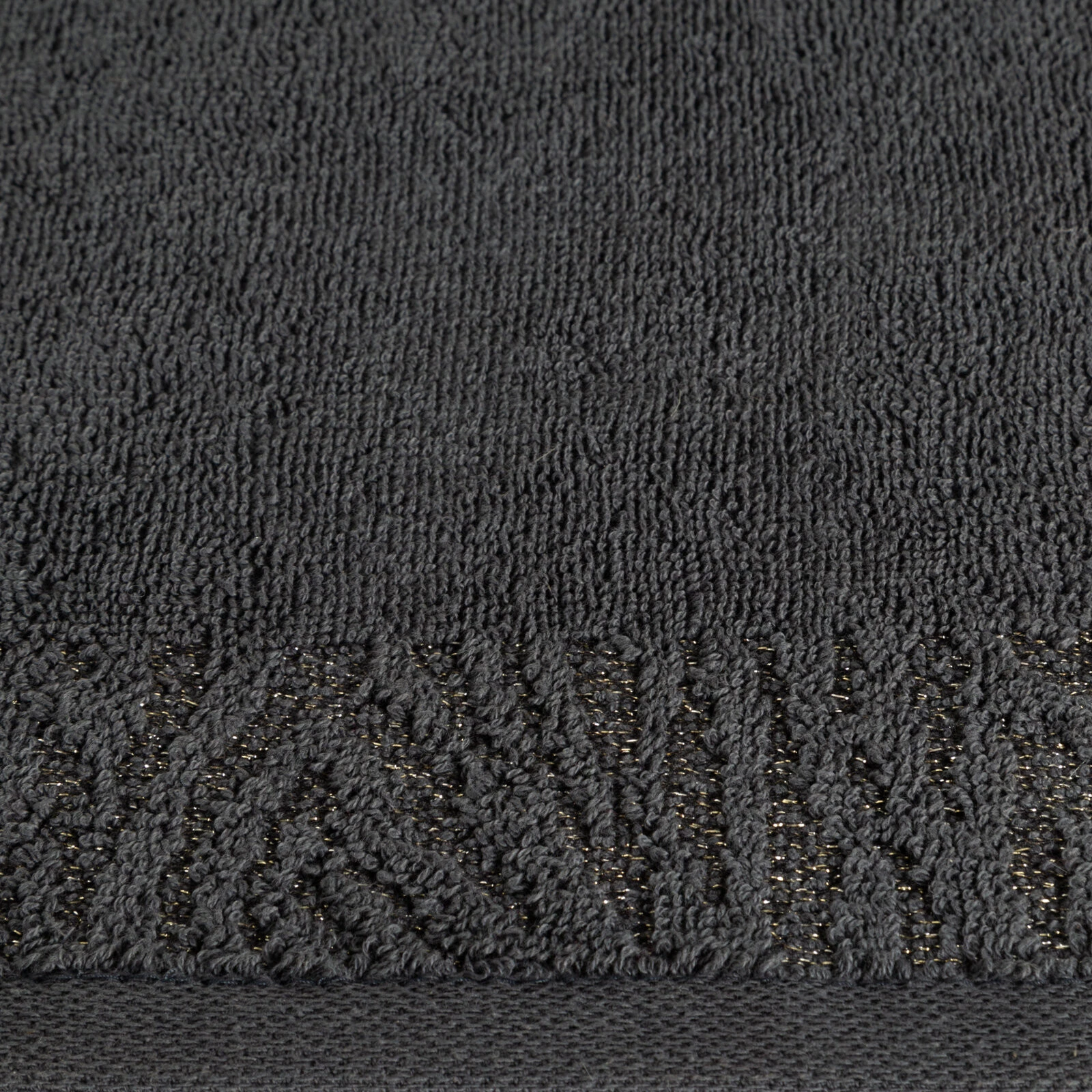 Ręcznik bawełniany z ozdobną bordiurą przetykaną błyszczącą nicią szerokość: 50 cm, długość: 90 cm, kolor: stalowy, Gramatura: 500 GSM, Skład: 100% bawełna; część ozdobna: 50% bawełna, 50% poliester