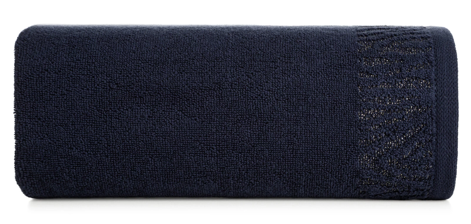 Ręcznik bawełniany z ozdobną bordiurą przetykaną błyszczącą nicią szerokość: 50 cm, długość: 90 cm, kolor: granatowy, Gramatura: 500 GSM, Skład: 100% bawełna; część ozdobna: 50% bawełna, 50% poliester