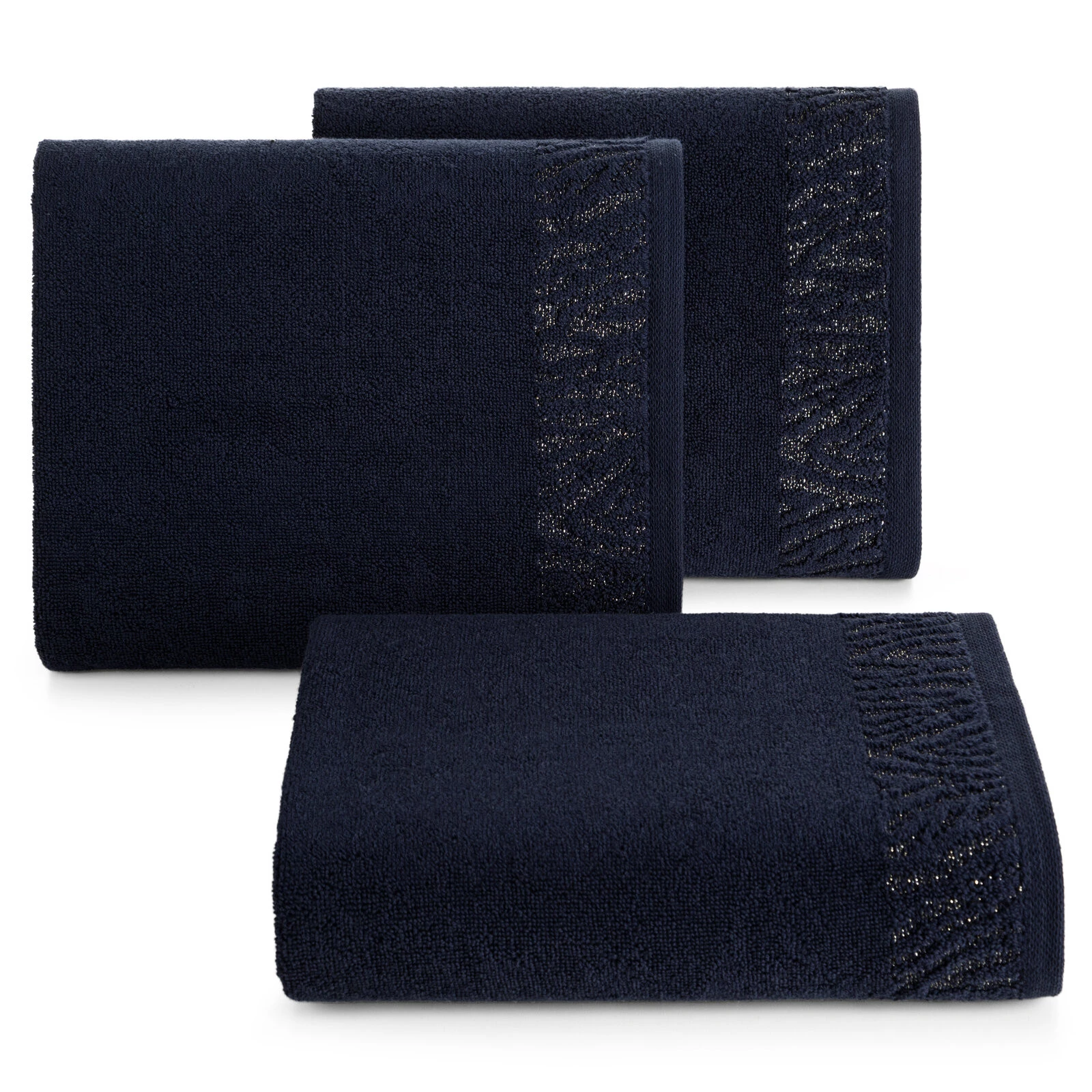 Ręcznik bawełniany z ozdobną bordiurą przetykaną błyszczącą nicią szerokość: 70 cm, długość: 140 cm, kolor: granatowy, Gramatura: 500 GSM, Skład: 100% bawełna; część ozdobna: 50% bawełna, 50% poliester