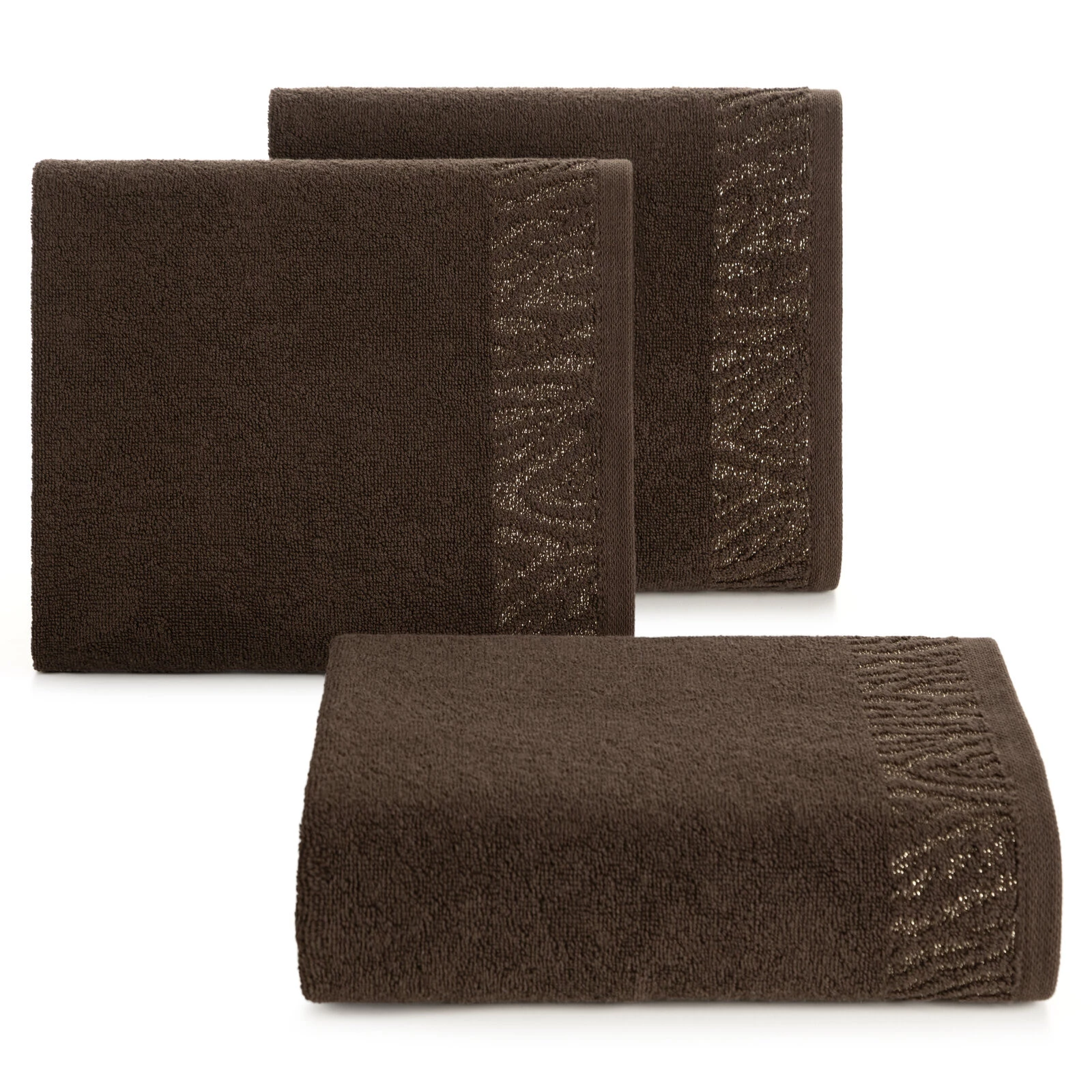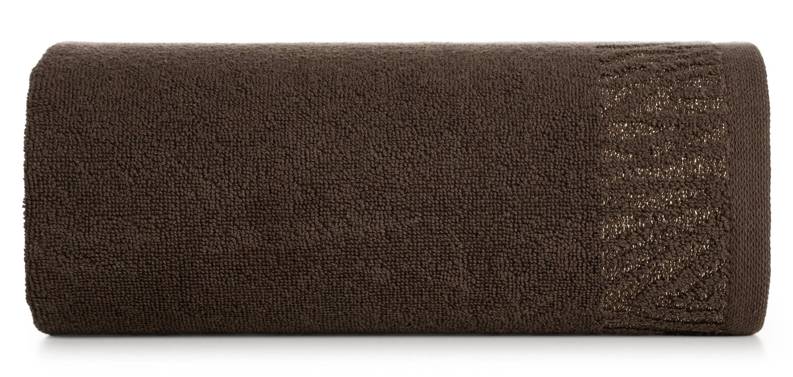 Ręcznik bawełniany z ozdobną bordiurą przetykaną błyszczącą nicią szerokość: 50 cm, długość: 90 cm, kolor: brązowy, Gramatura: 500 GSM, Skład: 100% bawełna; część ozdobna: 50% bawełna, 50% poliester