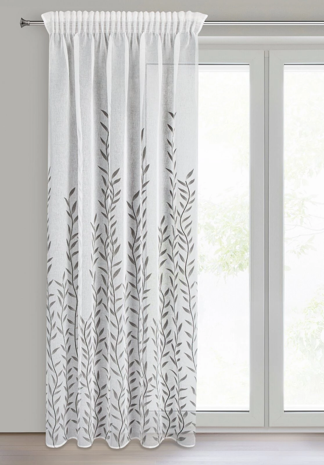 Firana gotowa z delikatnym błyszczącym nadrukiem szerokość: 140 cm, długość: 270 cm, kolor: biały, Gramatura: 75 GSM, Skład: 100% poliester