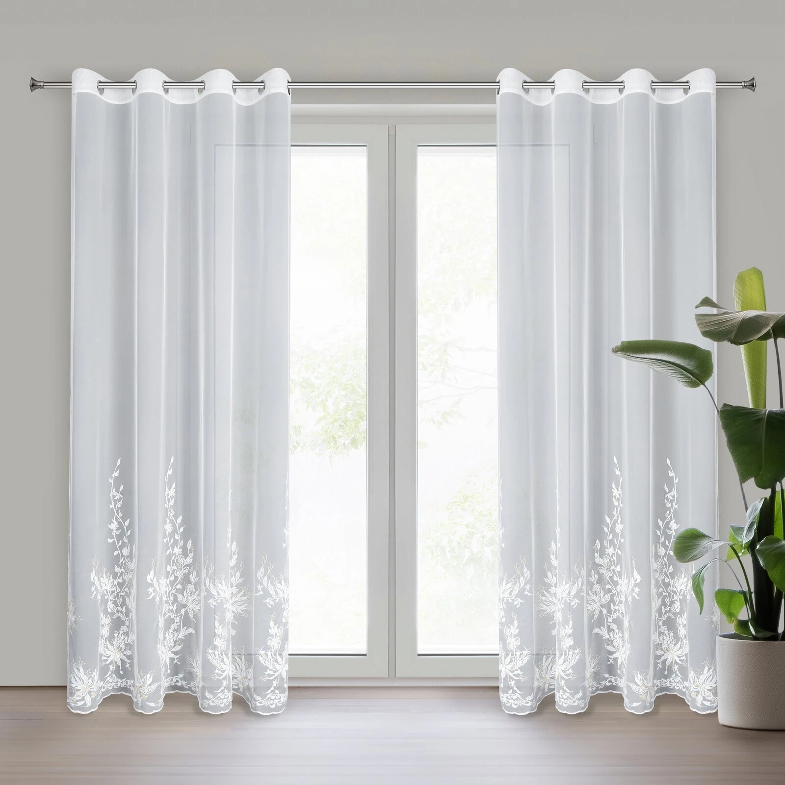Firana gotowa zdobiona haftem z błyszczącej nici oraz perełkami szerokość: 140 cm, długość: 250 cm, kolor: biały, Gramatura: 55 GSM, Skład: 100% poliester