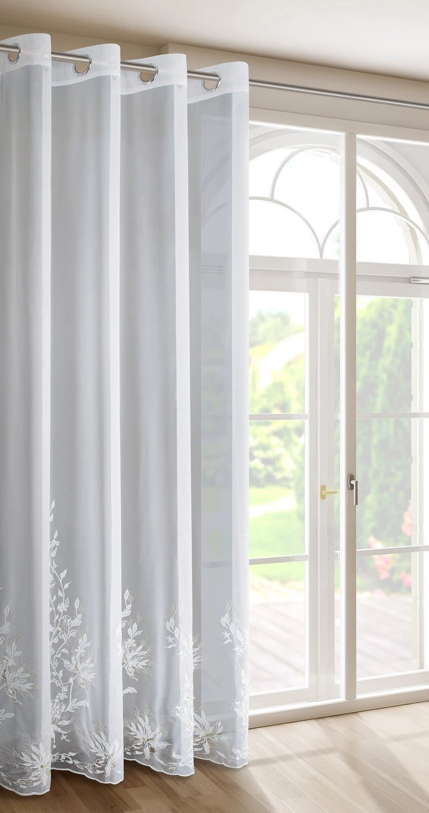 - Firana gotowa zdobiona haftem z błyszczącej nici oraz perełkami szerokość: 140 cm, długość: 250 cm, kolor: biały, Gramatura: 55 GSM, Skład: 100% poliester