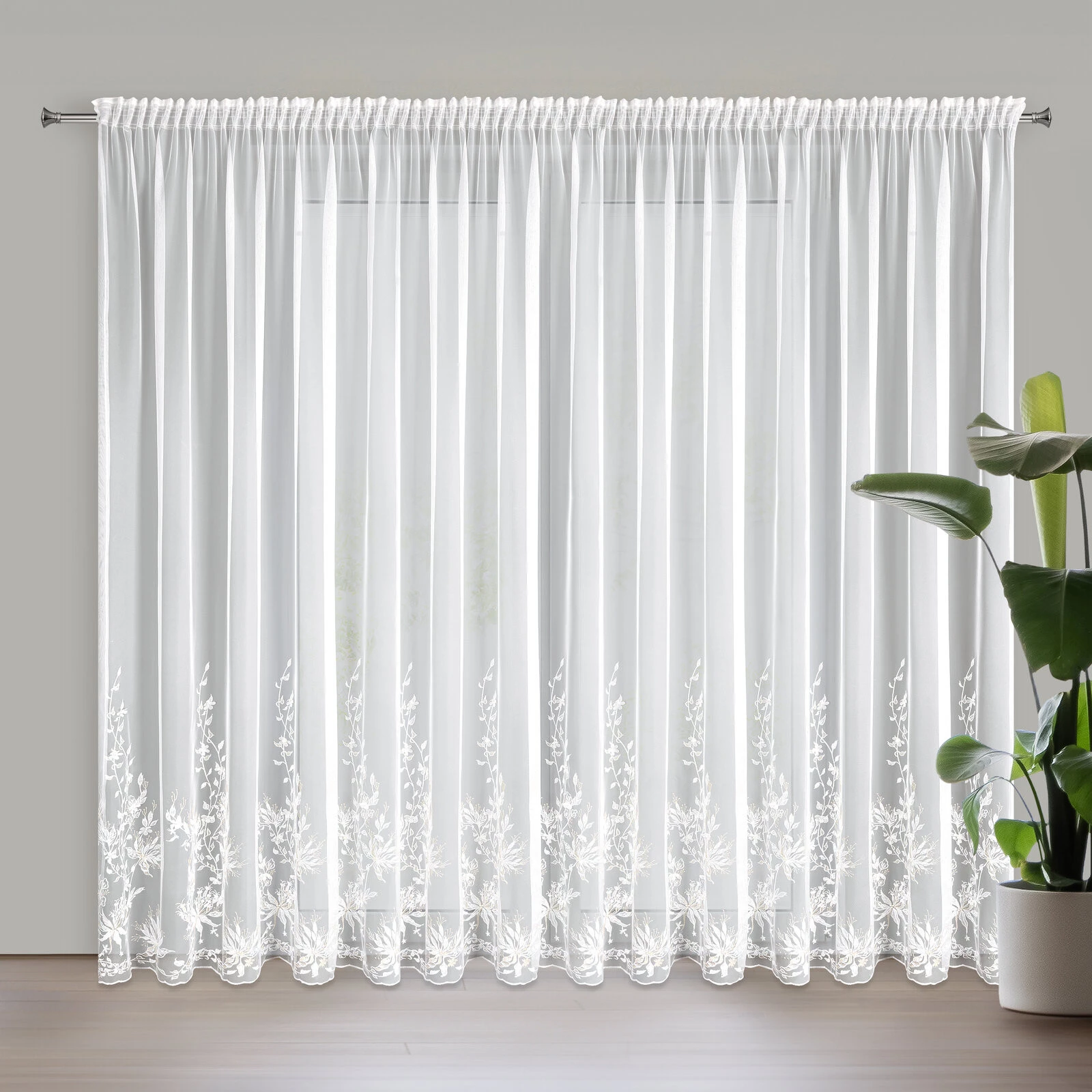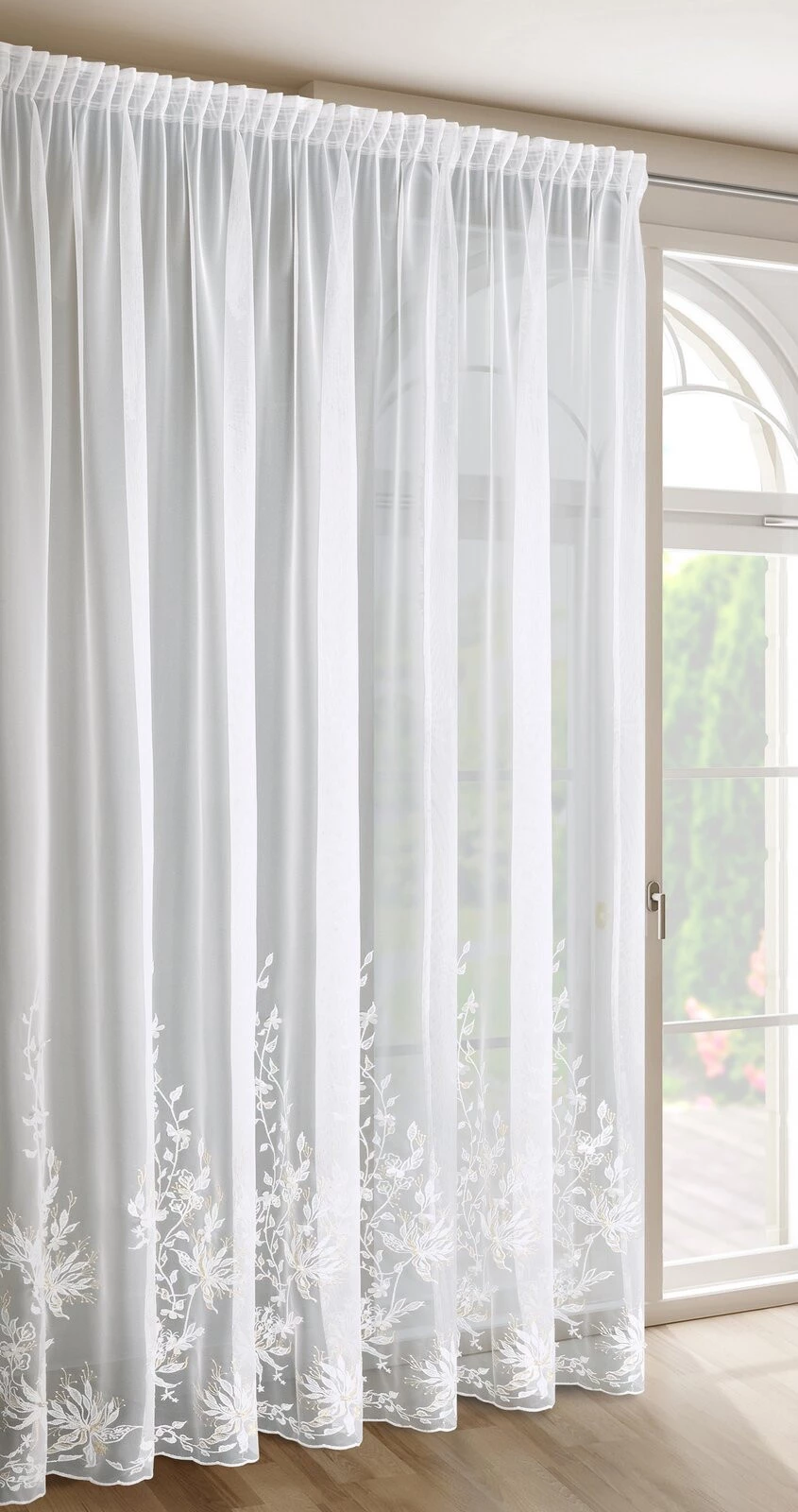 - Firana gotowa zdobiona haftem z błyszczącej nici oraz perełkami szerokość: 350 cm, długość: 270 cm, kolor: biały, Gramatura: 55 GSM, Skład: 100% poliester