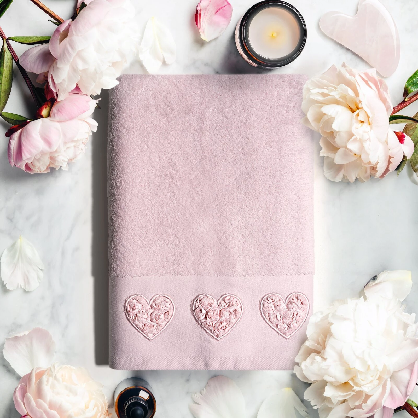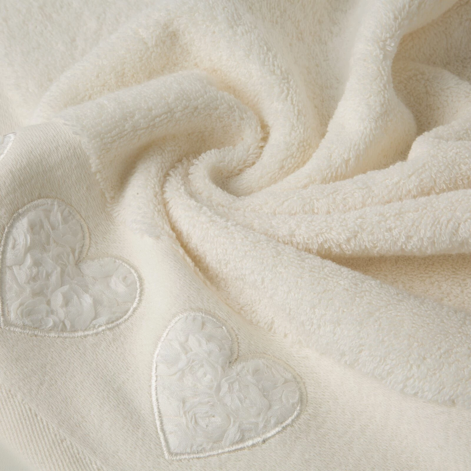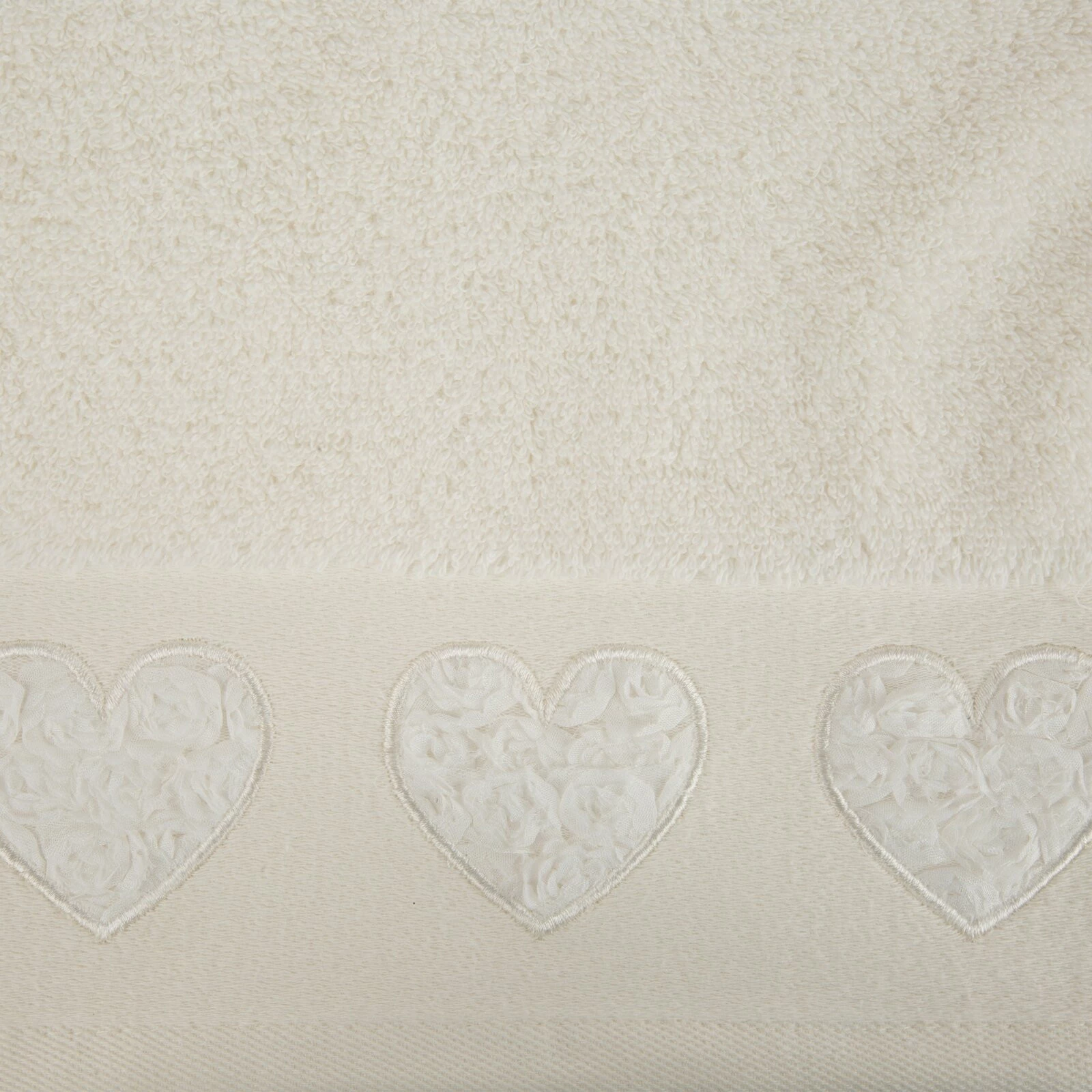 Piękny ręcznik kąpielowy z miękkiej i chłonnej bawełny frotte zdobiony na bordiurze aplikacją w formie serduszek wypełnionych różyczkami. Doskonały na prezent. szerokość: 50 cm, długość: 90 cm, kolor: kremowy, Gramatura: 500 GSM, Skład: 100% bawełna; część ozdobna: 100% poliester