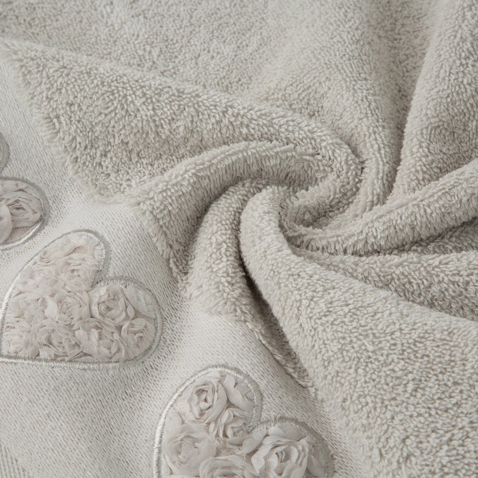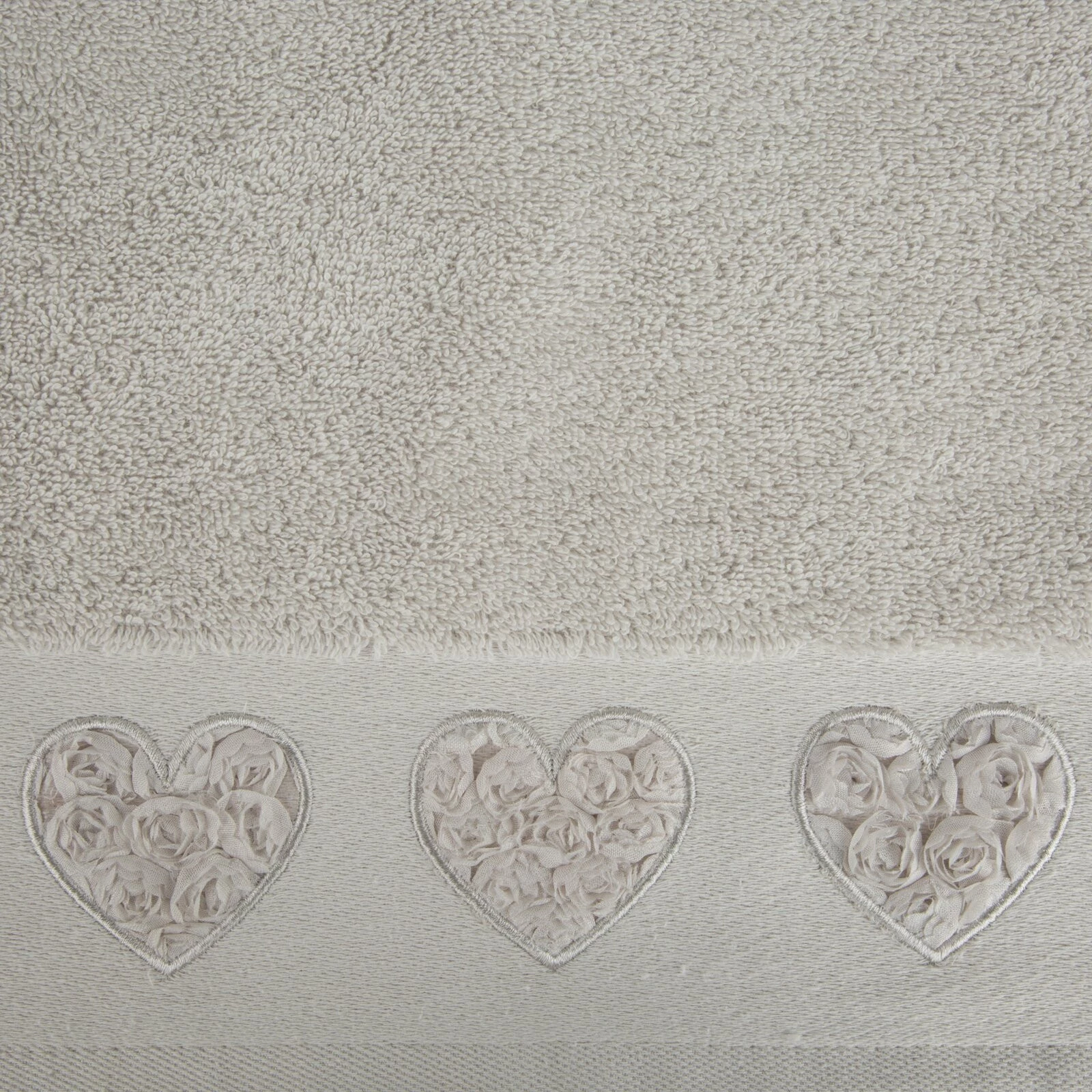 Piękny ręcznik kąpielowy z miękkiej i chłonnej bawełny frotte zdobiony na bordiurze aplikacją w formie serduszek wypełnionych różyczkami. Doskonały na prezent. szerokość: 50 cm, długość: 90 cm, kolor: szary, Gramatura: 500 GSM, Skład: 100% bawełna; część ozdobna: 100% poliester