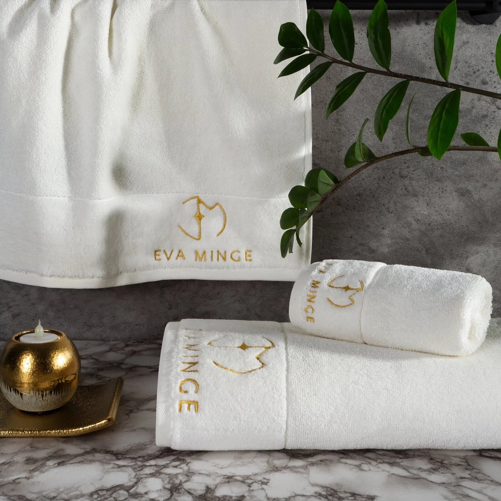 Ręcznik z welurową bordiurą i haftem szerokość: 46 cm, długość: 36 cm, kolor: kremowy, Gramatura: 550 GSM, Skład: 100% bawełna; część ozdobna: 99% bawełna, 1% poliester