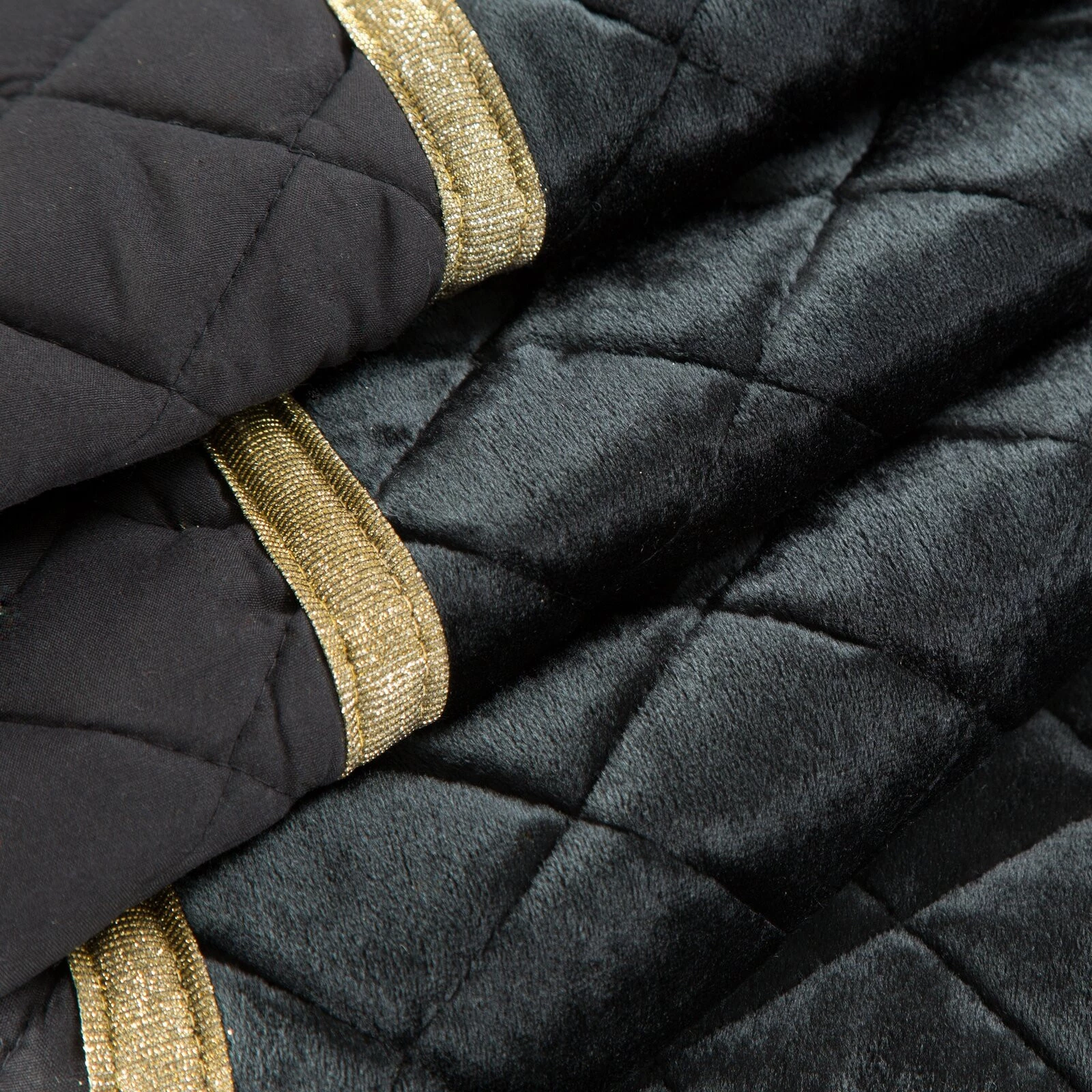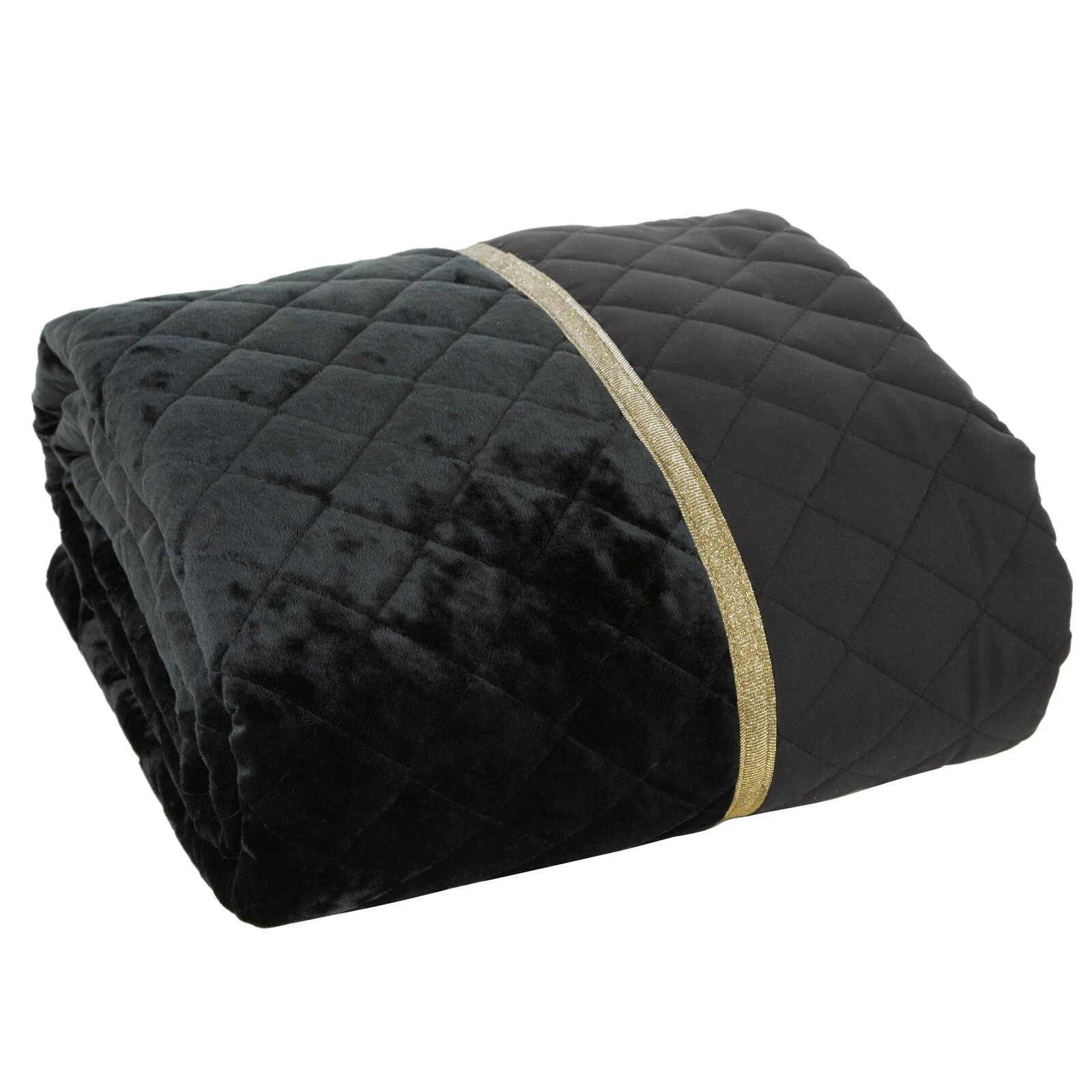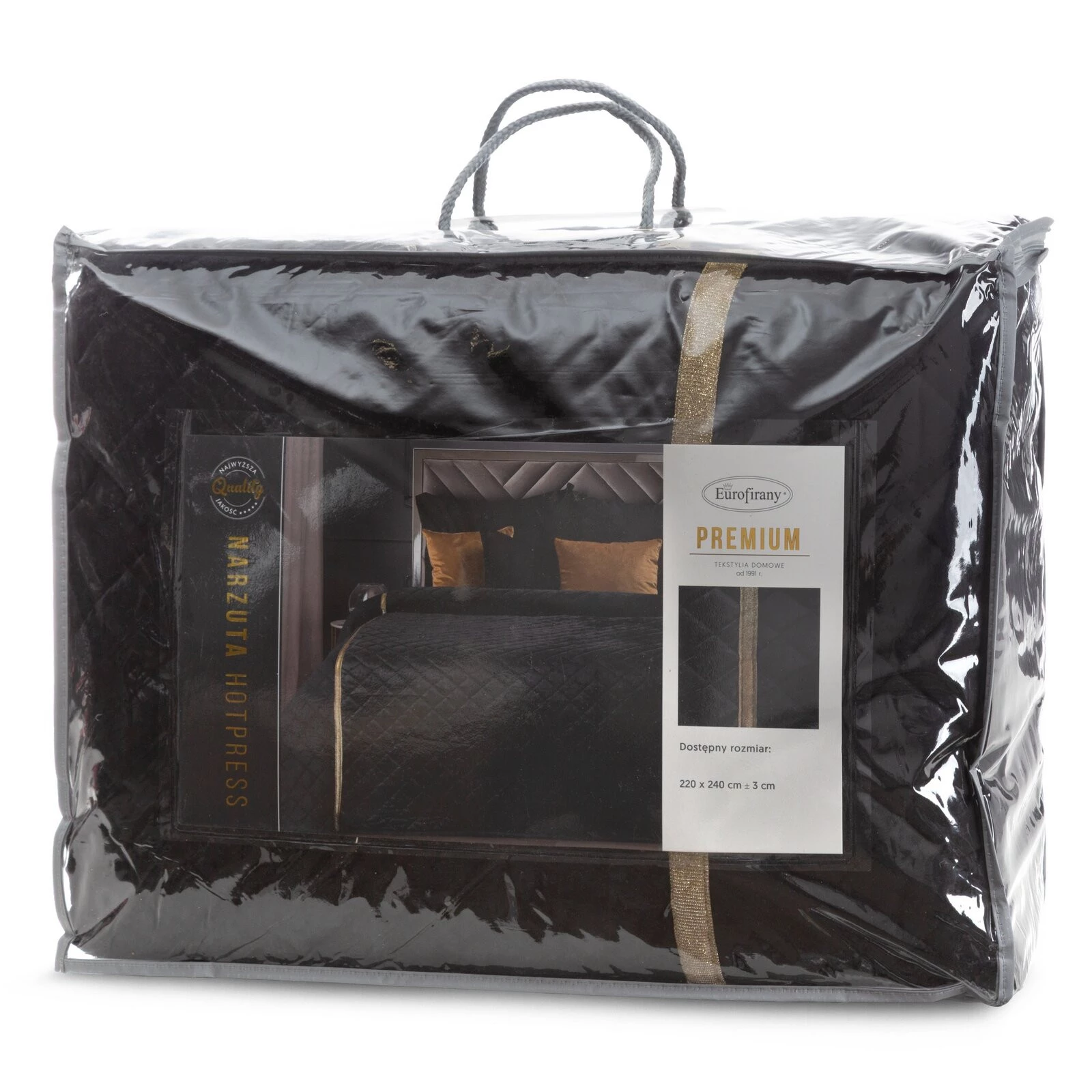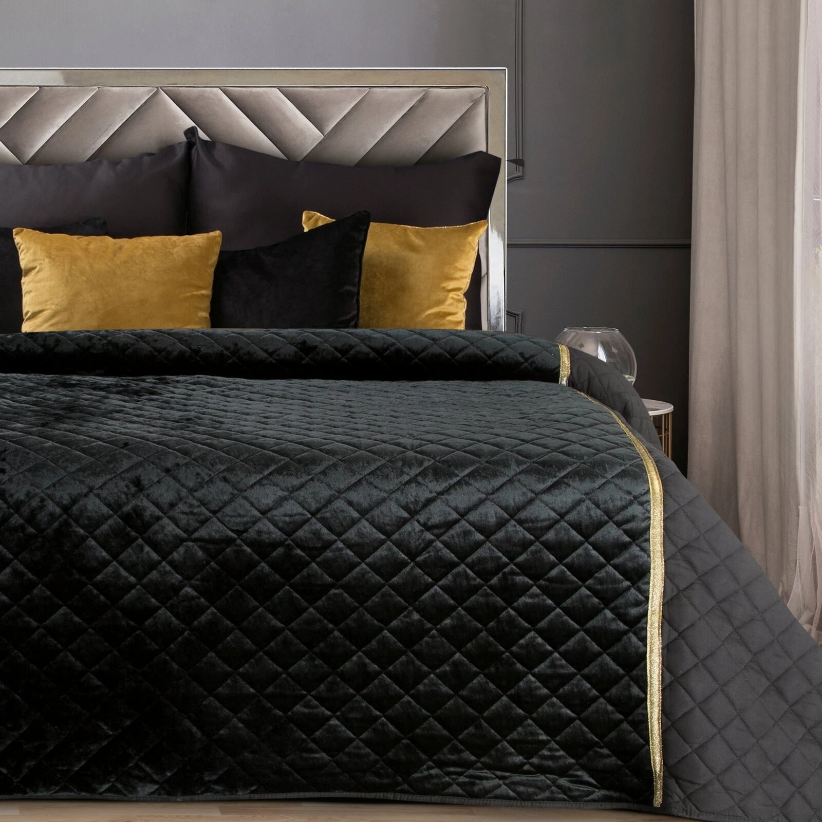 Elegancka, mięsista narzuta z wysokiej jakości welwetu o charakterystycznym połysku. Powierchnia pikowana tradycyjną metodą. Brzegi wykończone lśniącą lamówką. szerokość: 220 cm, długość: 240 cm, kolor: czarny, Gramatura: 220+70+180 GSM, Skład: 100% poliester