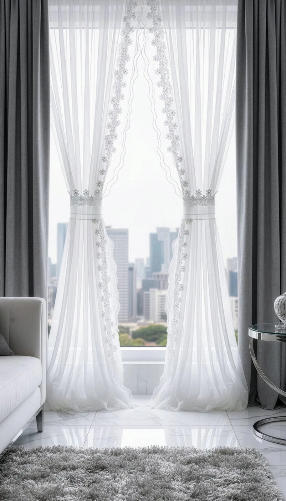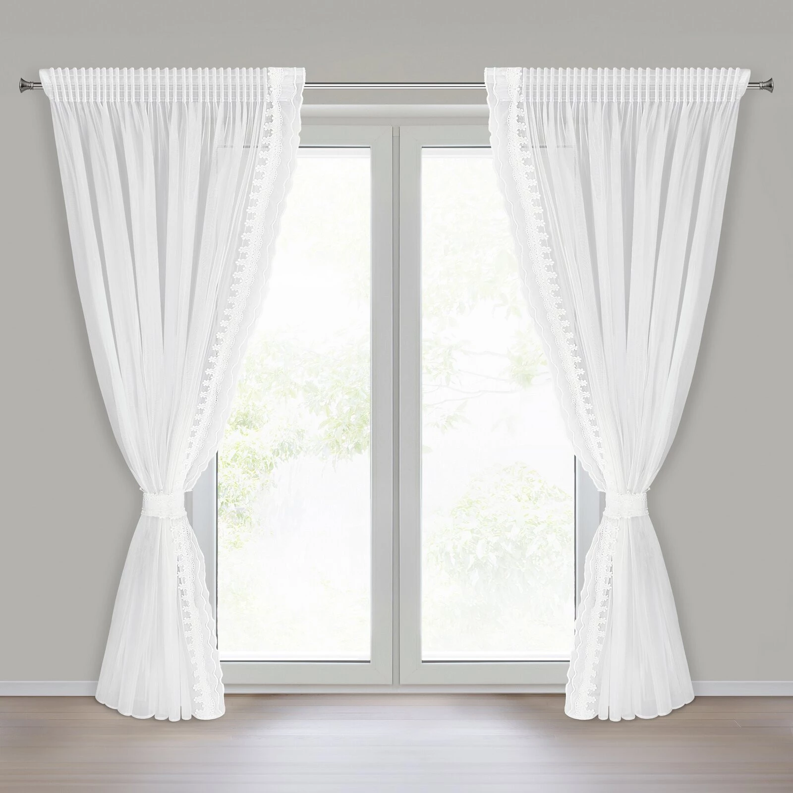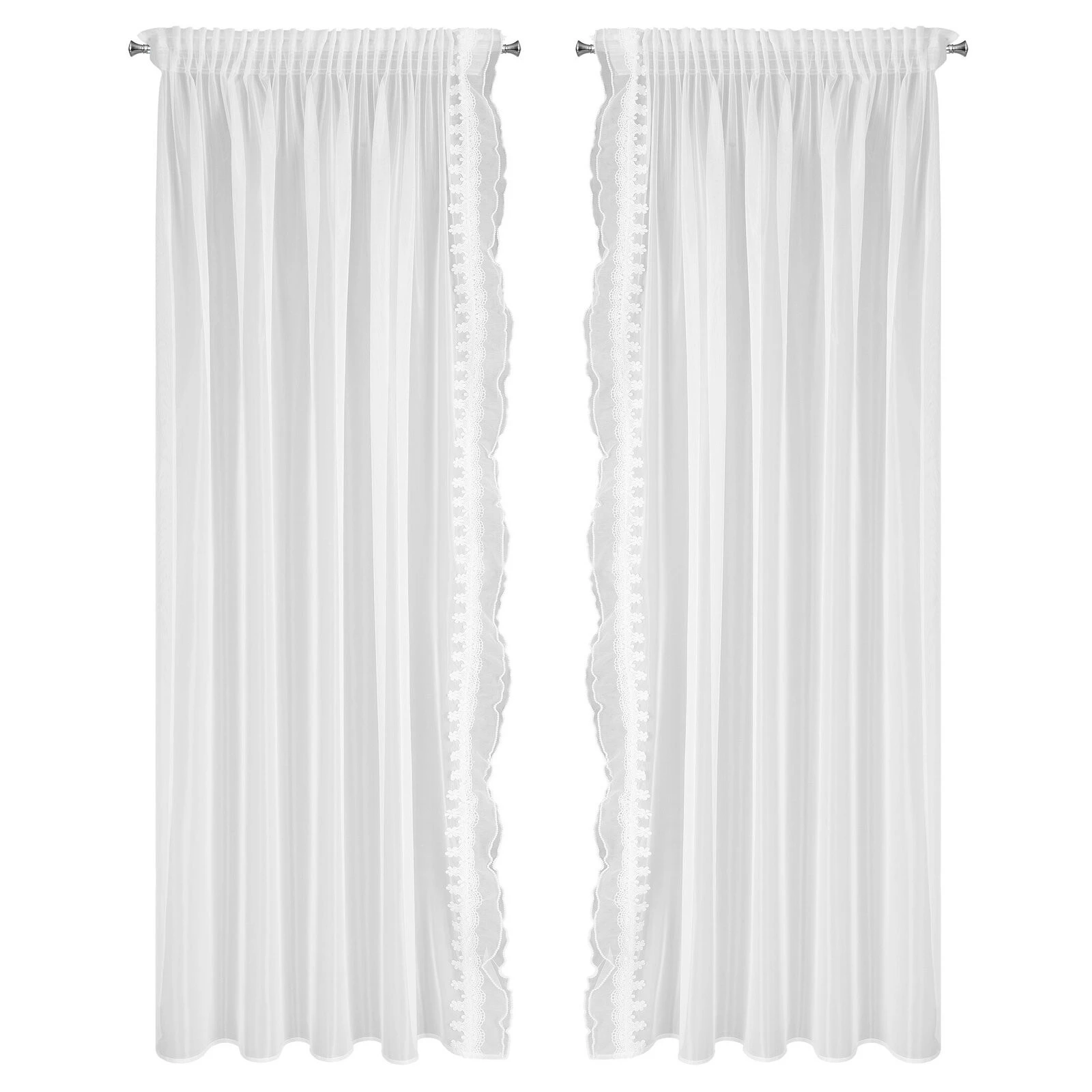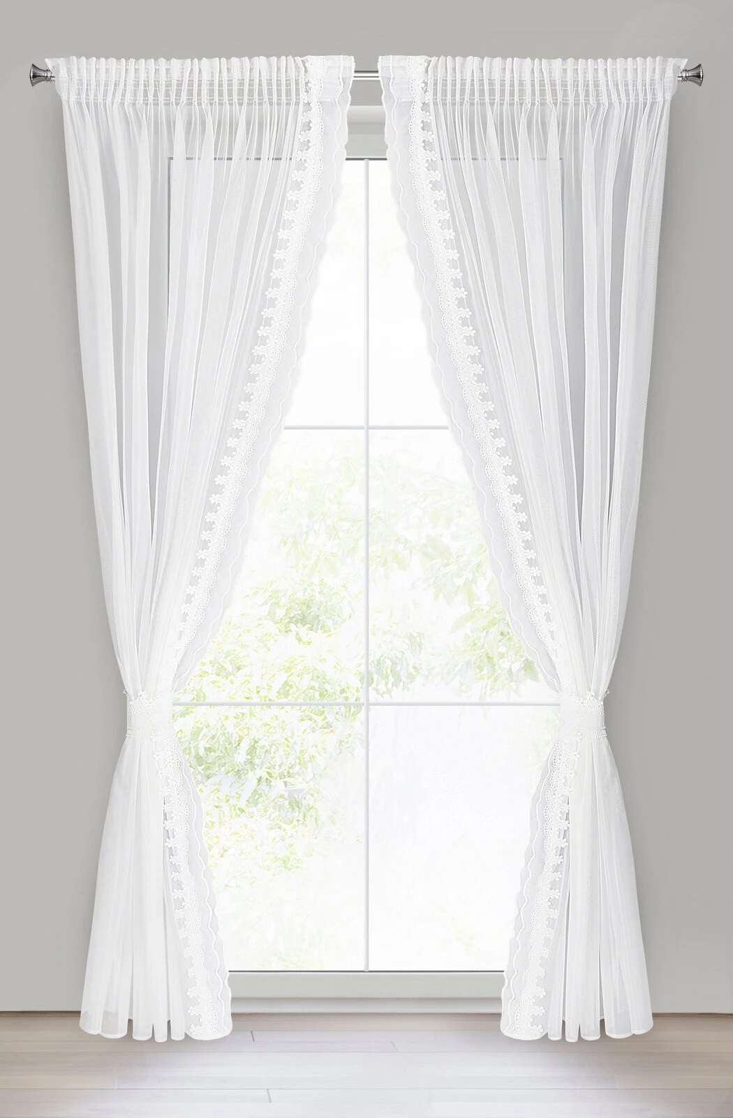 Komplet zasłon gotowych zdobiony obszywką szerokość: 140 cm, długość: 270 cm, kolor: biały, Gramatura: 80 GSM, Skład: 100% poliester