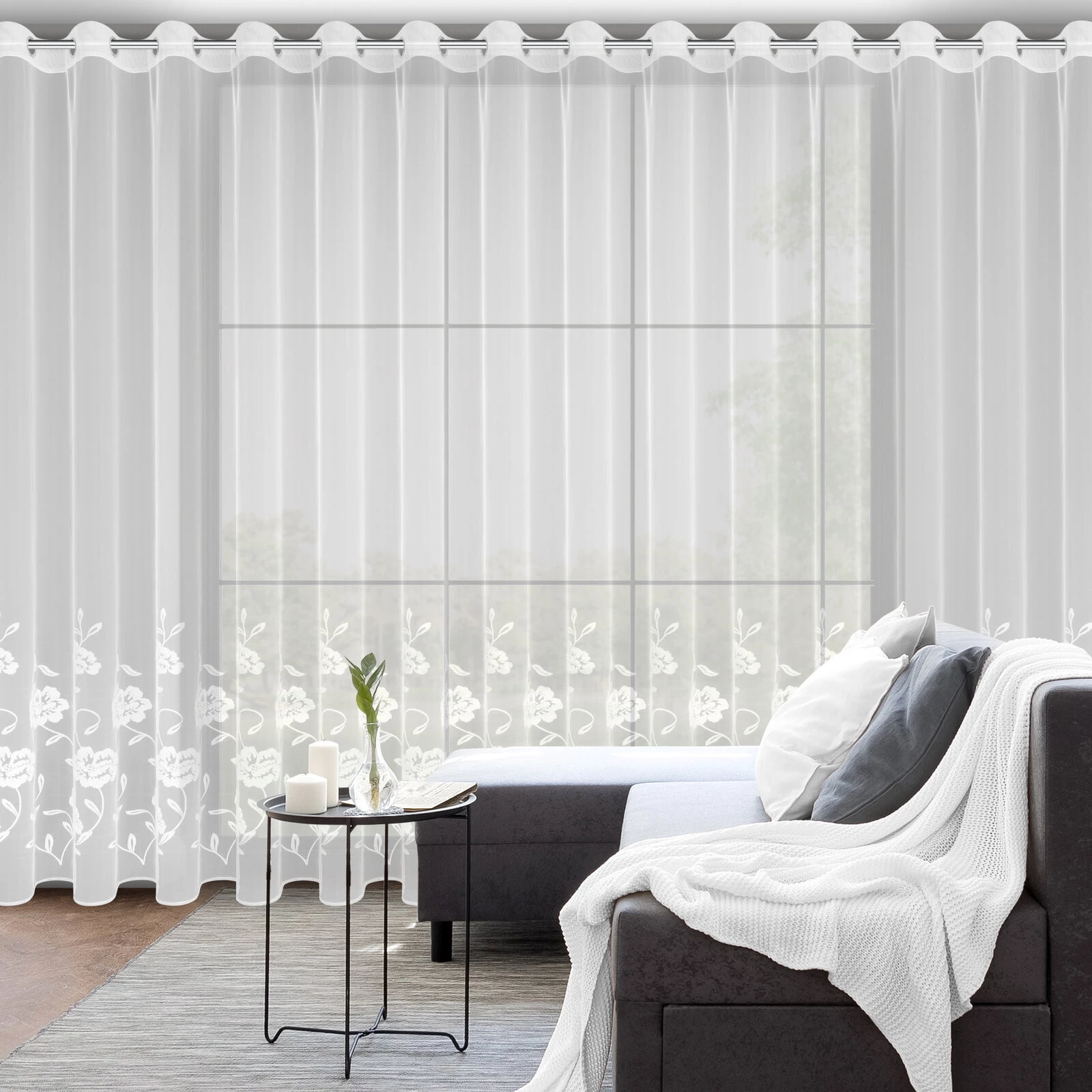 Firana gotowa zdobiona haftem szerokość: 350 cm, długość: 250 cm, kolor: biały, Gramatura: 70 GSM, Skład: 100% poliester