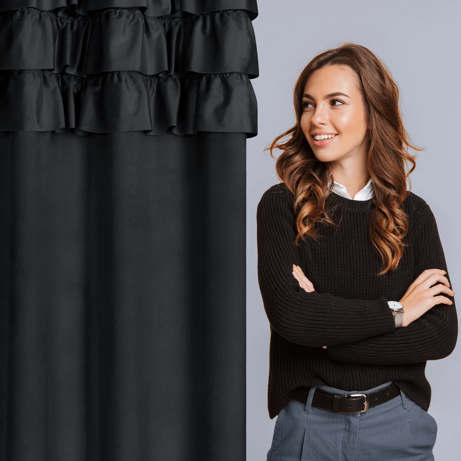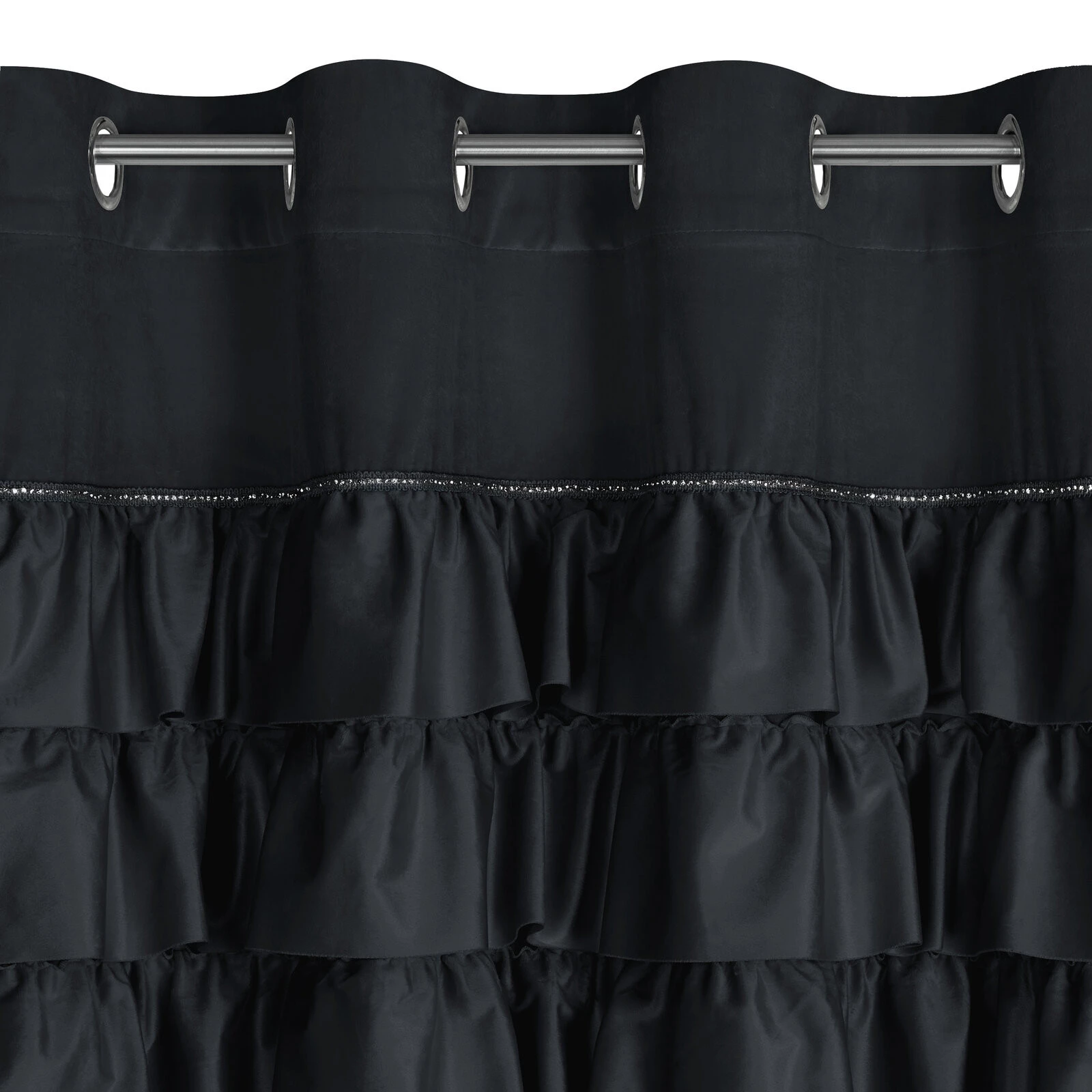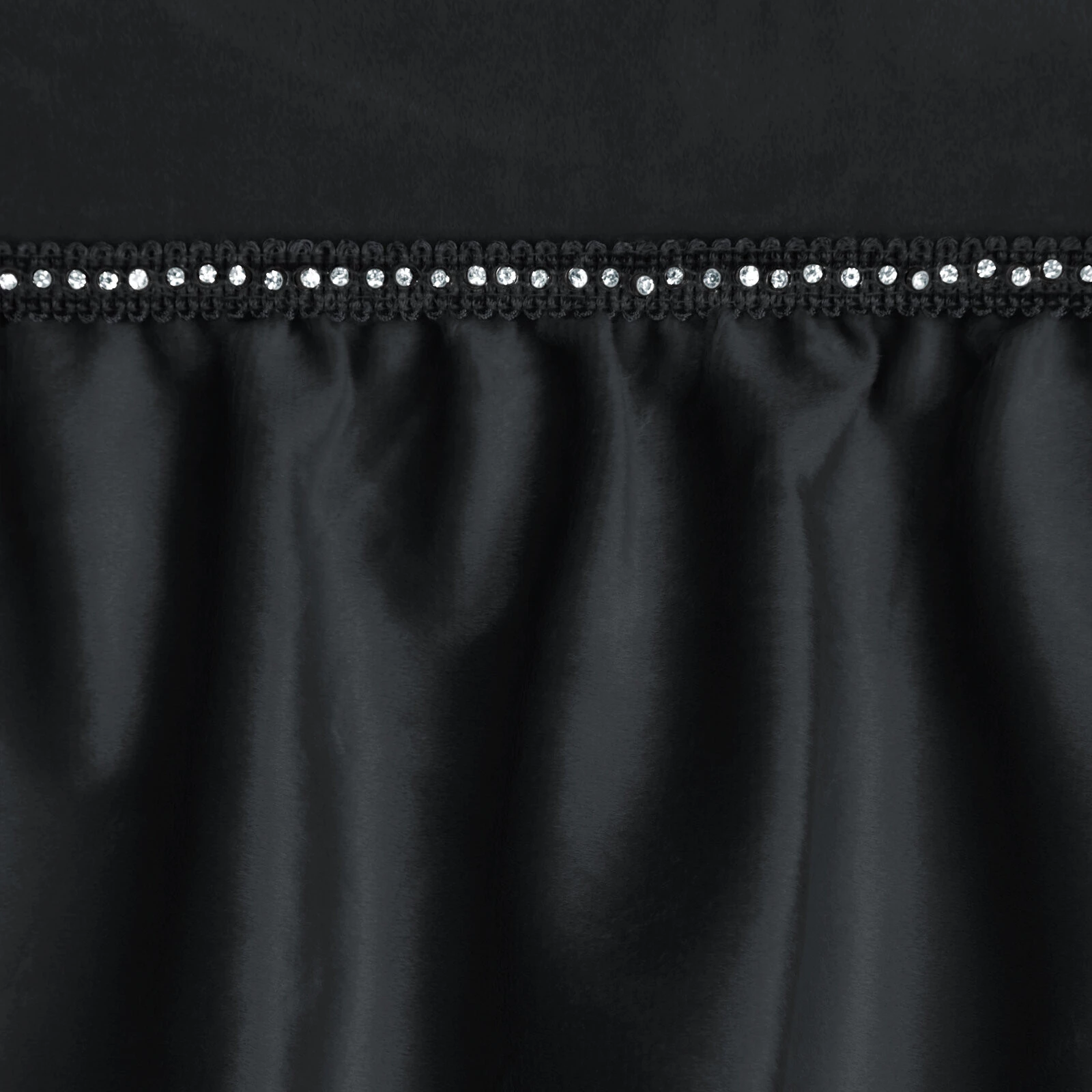 - Zasłona gotowa zdobiona w górnej części falbanami i taśmą z cyrkoniami szerokość: 140 cm, długość: 250 cm, kolor: czarny, Gramatura: 200 GSM, Skład: 100% poliester