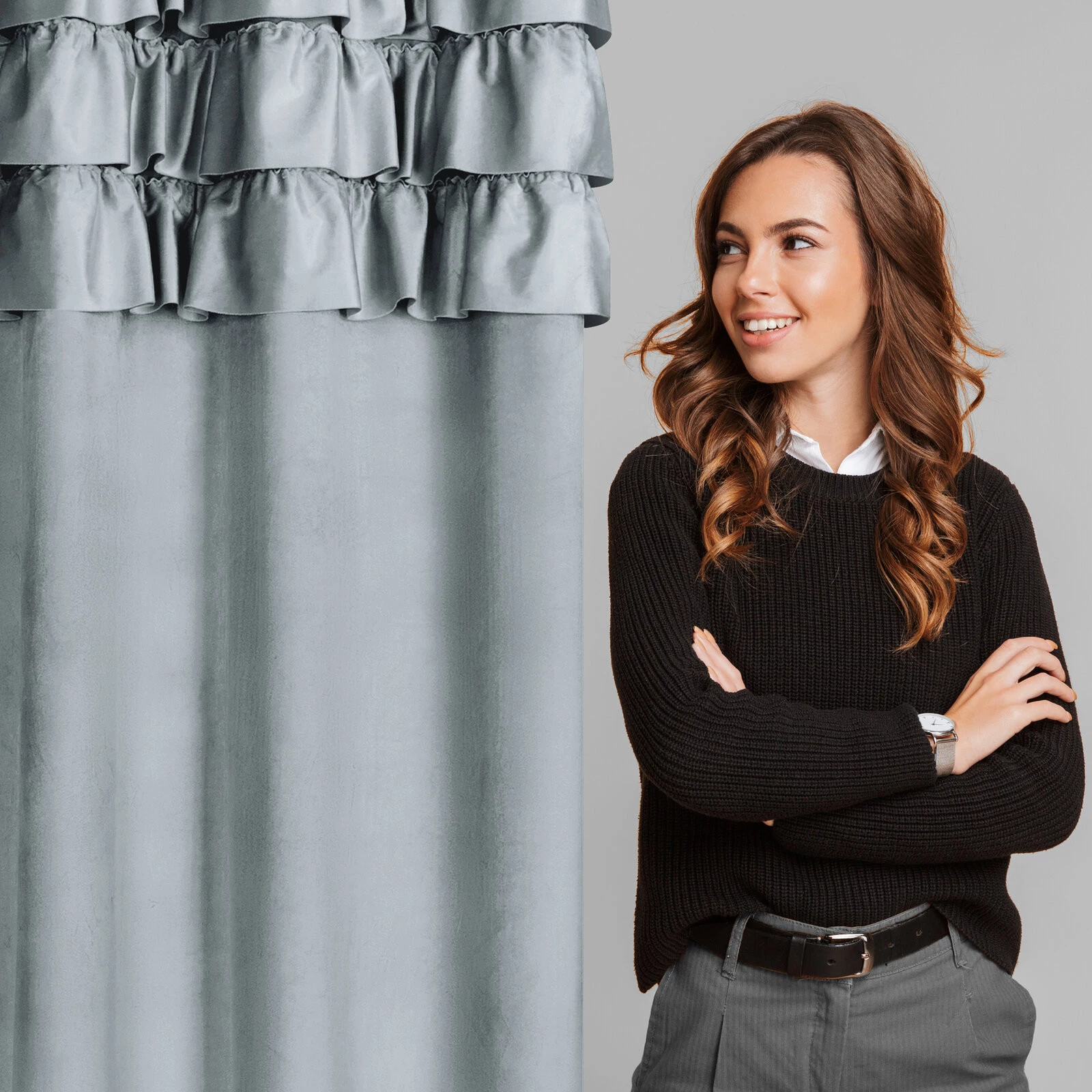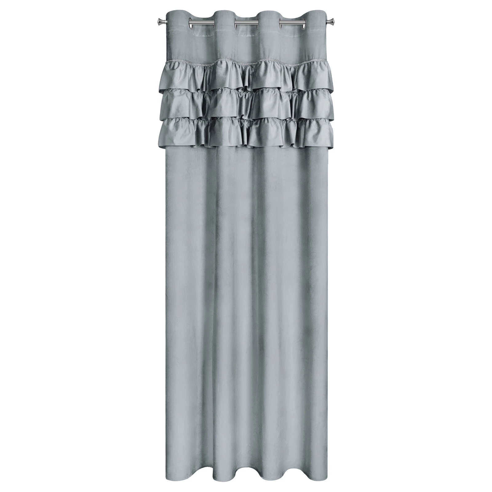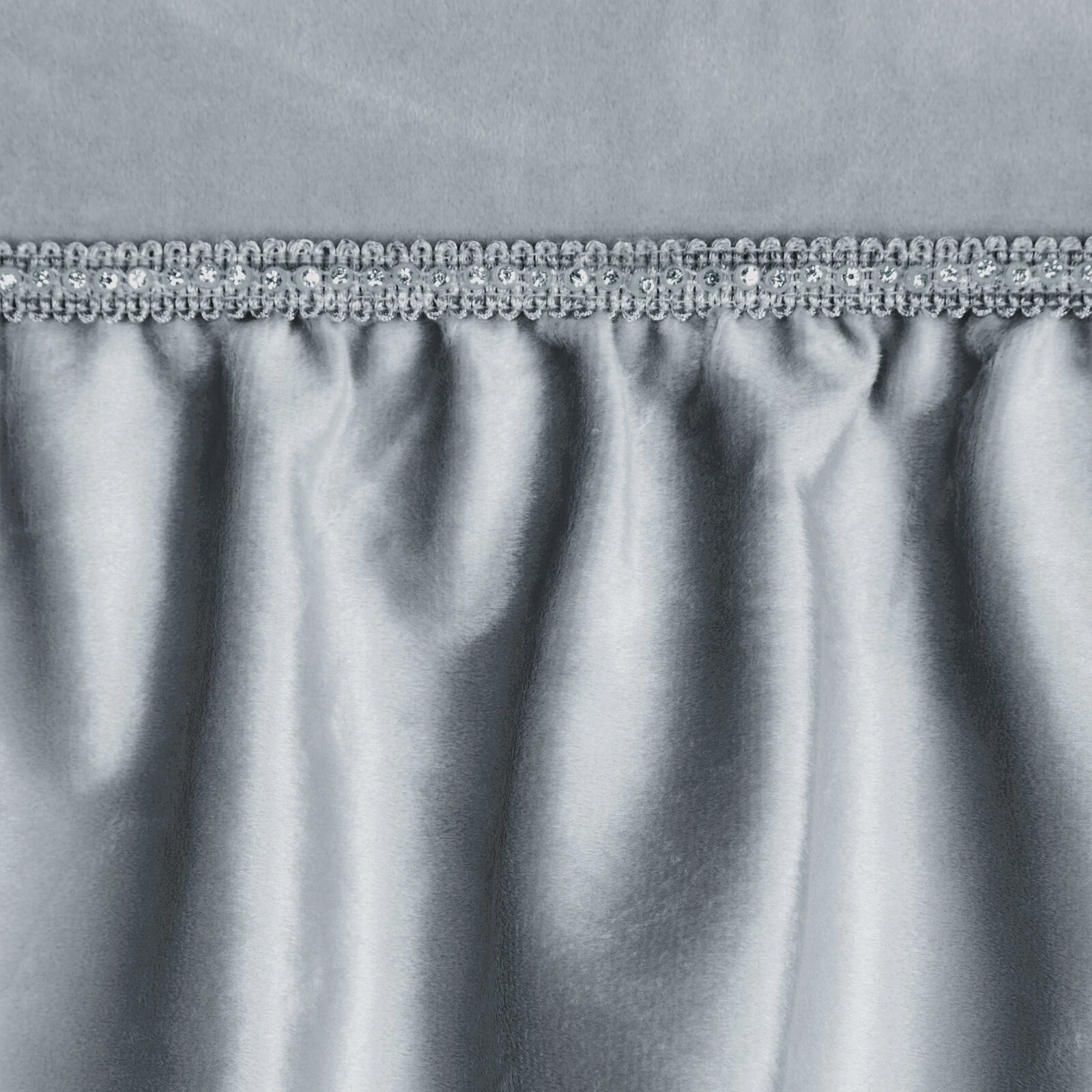 - Zasłona gotowa zdobiona w górnej części falbanami i taśmą z cyrkoniami szerokość: 140 cm, długość: 250 cm, kolor: srebrny, Gramatura: 200 GSM, Skład: 100% poliester