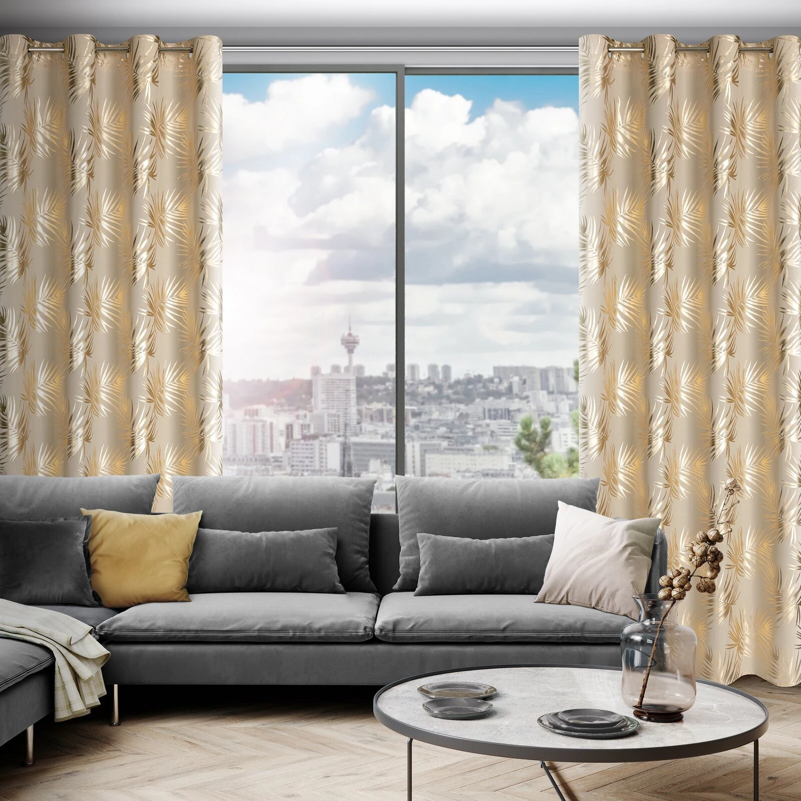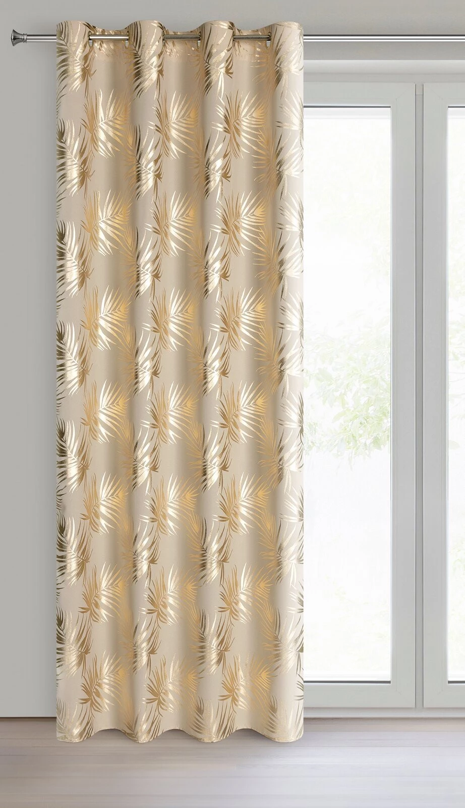 Zasłona gotowa z nadrukiem błyszczącym szerokość: 140 cm, długość: 250 cm, kolor: beżowy, Gramatura: 140 GSM, Skład: 100% poliester