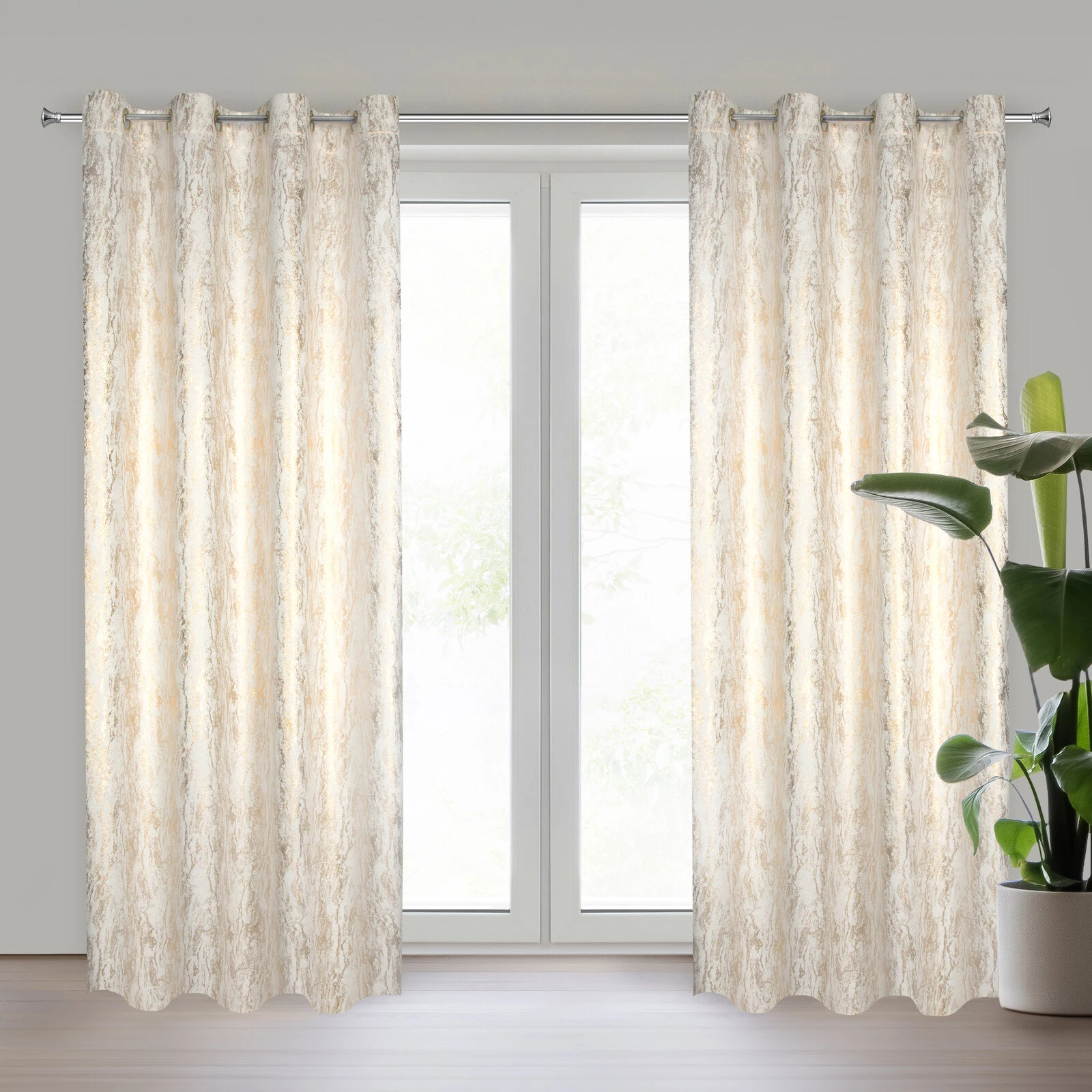 Zasłona gotowa zaciemniająca z nadrukiem błyszczącym szerokość: 140 cm, długość: 250 cm, kolor: biały, Gramatura: 230 GSM, Skład: 100% poliester