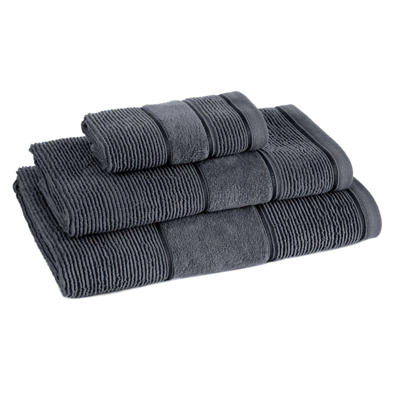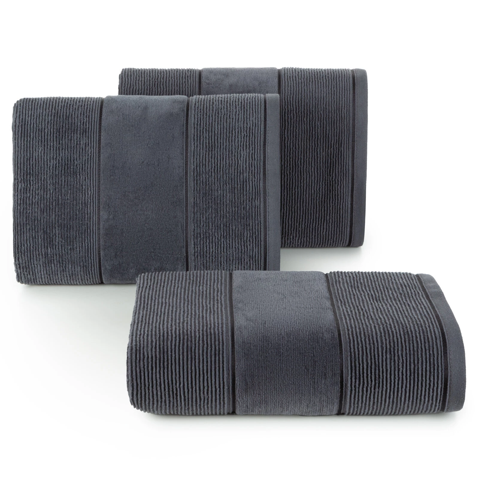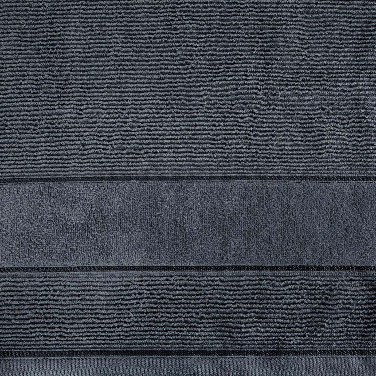 Ręcznik bawełniany o strukturze w prążki z welurową bordiurą szerokość: 70 cm, długość: 140 cm, kolor: stalowy, Gramatura: 500 GSM, Skład: 100% bawełna