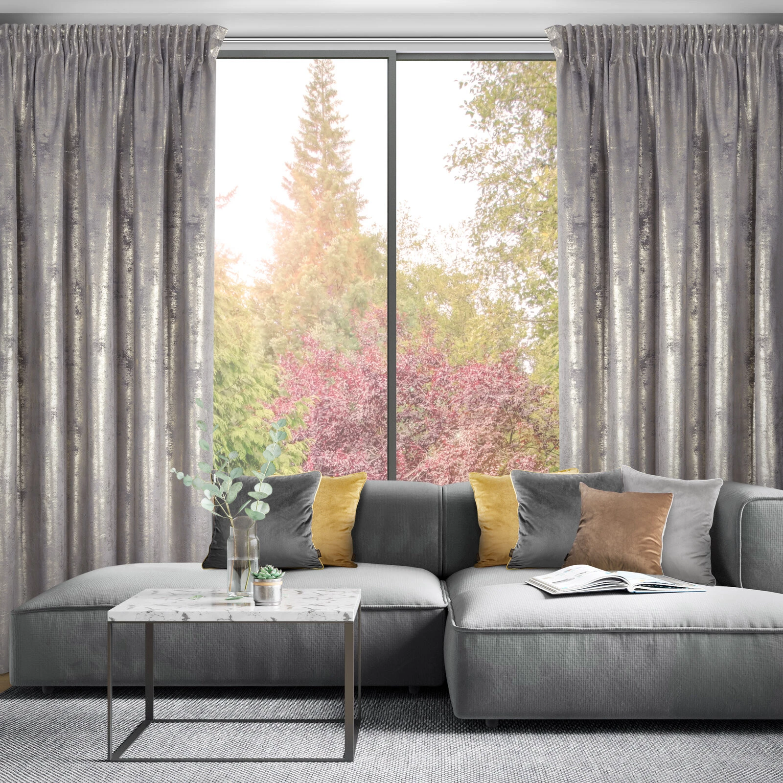 - Zasłona gotowa welwetowa z błyszczącym nadrukiem szerokość: 140 cm, długość: 270 cm, kolor: stalowy, Gramatura: 200 GSM, Skład: 100% poliester