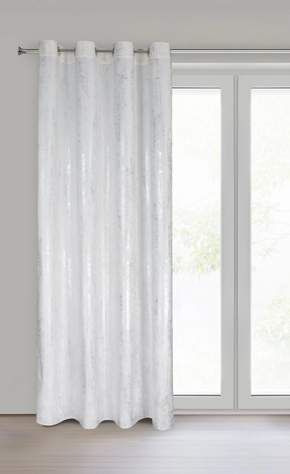 Zasłona gotowa welwetowa z błyszczącym nadrukiem szerokość: 140 cm, długość: 250 cm, kolor: biały, Gramatura: 200 GSM, Skład: 100% poliester