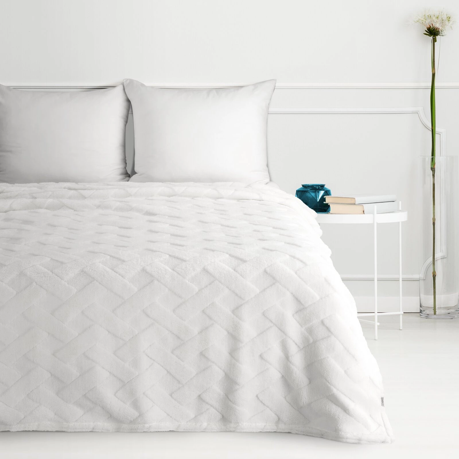 Klasyczny koc z przyjemnego w dotyku włókna w technologii mikroflano. Jednobarwna, puszysta faktura ozdobiona jest minimalistycznym tłoczeniem w formie jodełki. szerokość: 150 cm, długość: 200 cm, kolor: biały, Gramatura: 340 GSM, Skład: 100% poliester