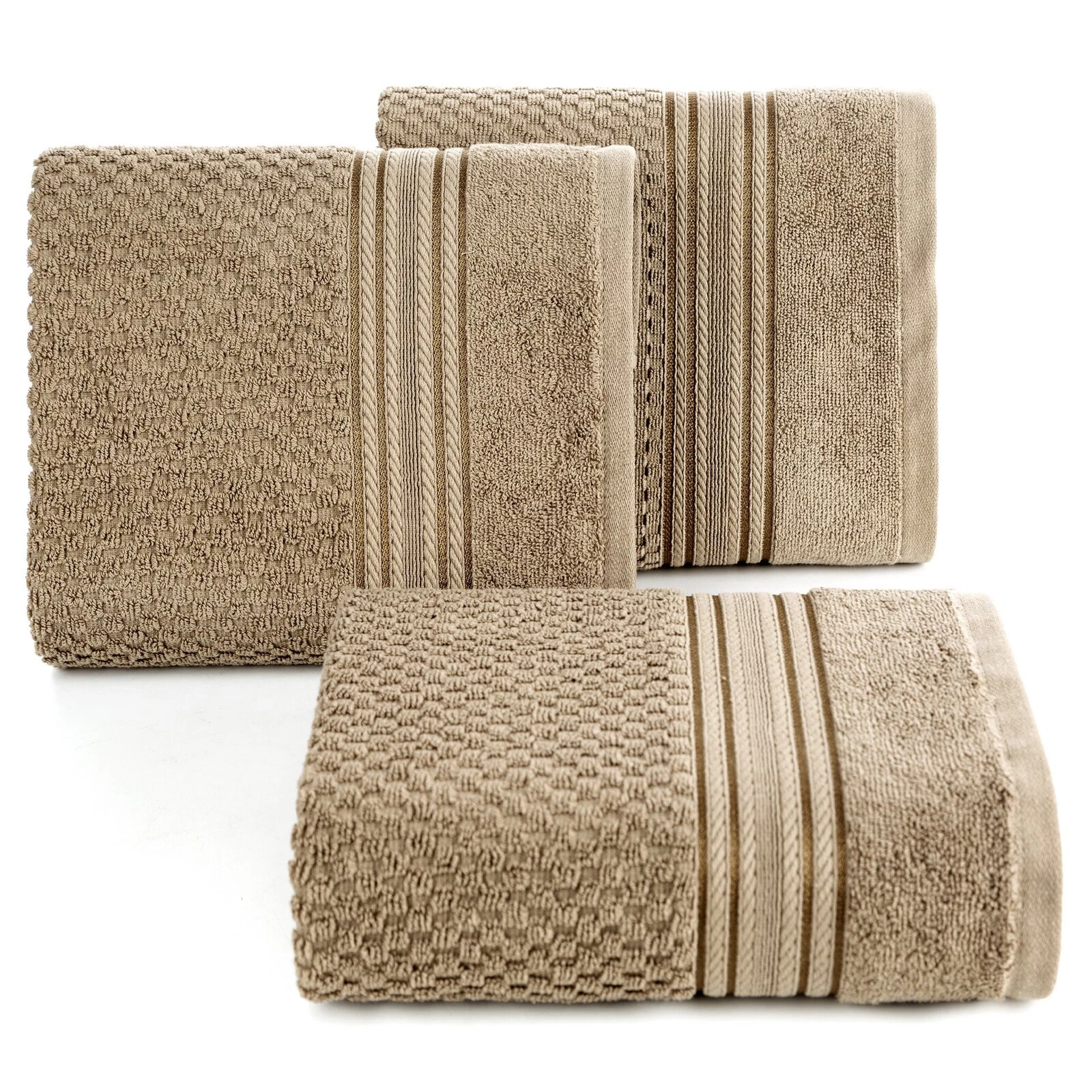 Jednobarwny ręcznik z miękkiej i chłonnej tkaniny bawełnianej o splocie frotte zdobiony kolorową bordiurą w stylu fastrygi. Łatwy w praniu, nie farbuje. szerokość: 70 cm, długość: 140 cm, kolor: beżowy, Gramatura: 500 GSM, Skład: 100% bawełna