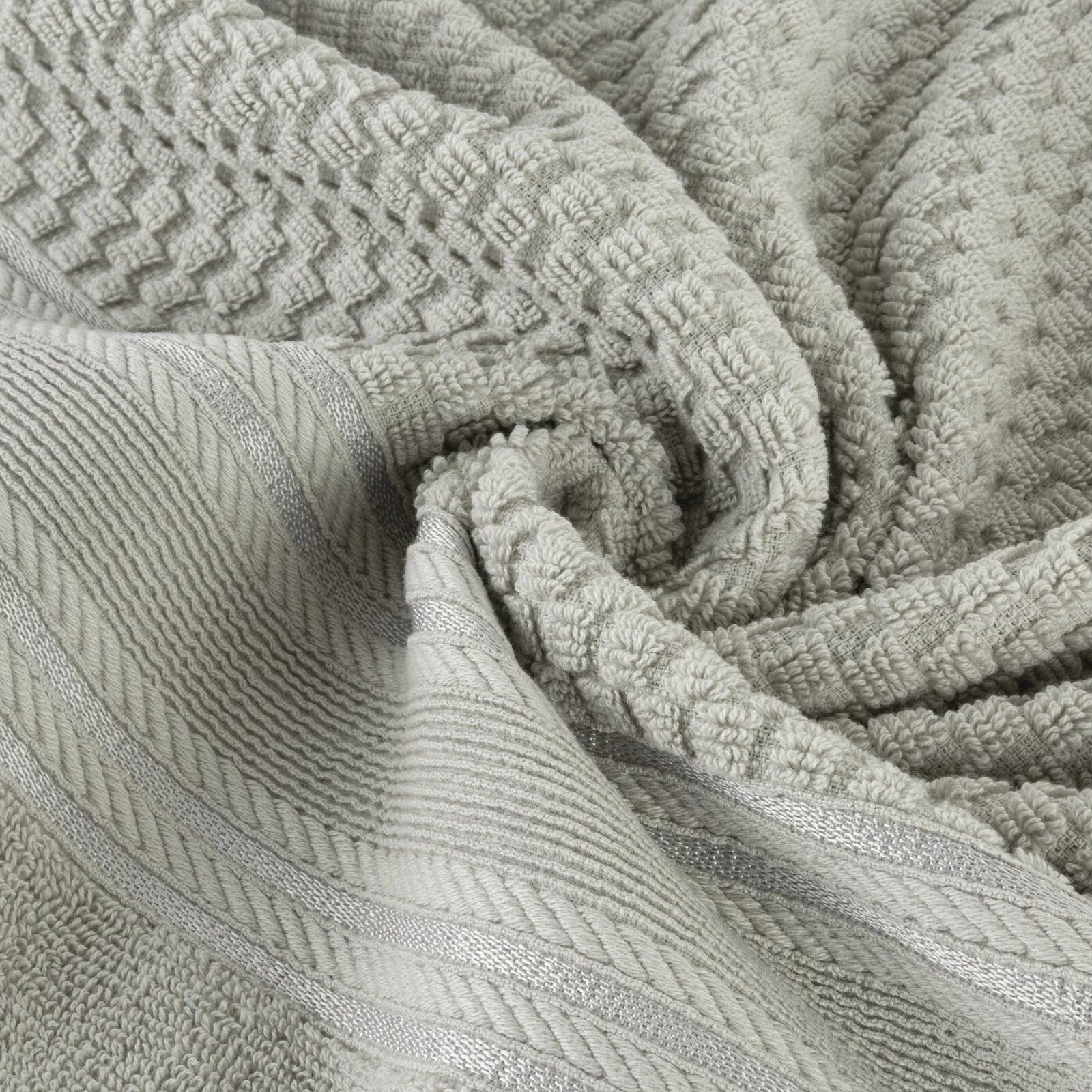 Jednobarwny ręcznik z miękkiej i chłonnej tkaniny bawełnianej o splocie frotte zdobiony kolorową bordiurą w stylu fastrygi. Łatwy w praniu, nie farbuje. szerokość: 30 cm, długość: 50 cm, kolor: srebrny, Gramatura: 500 GSM, Skład: 100% bawełna