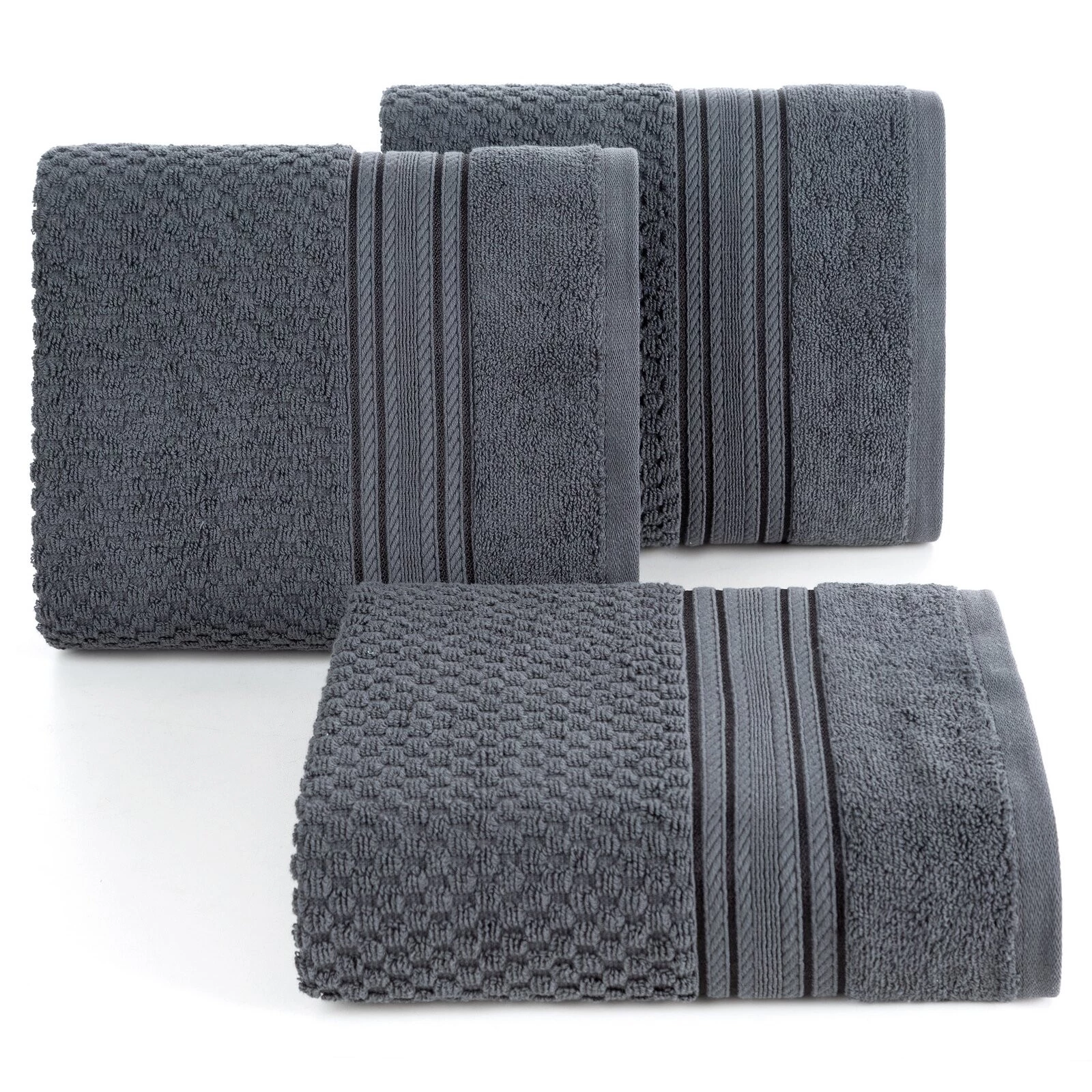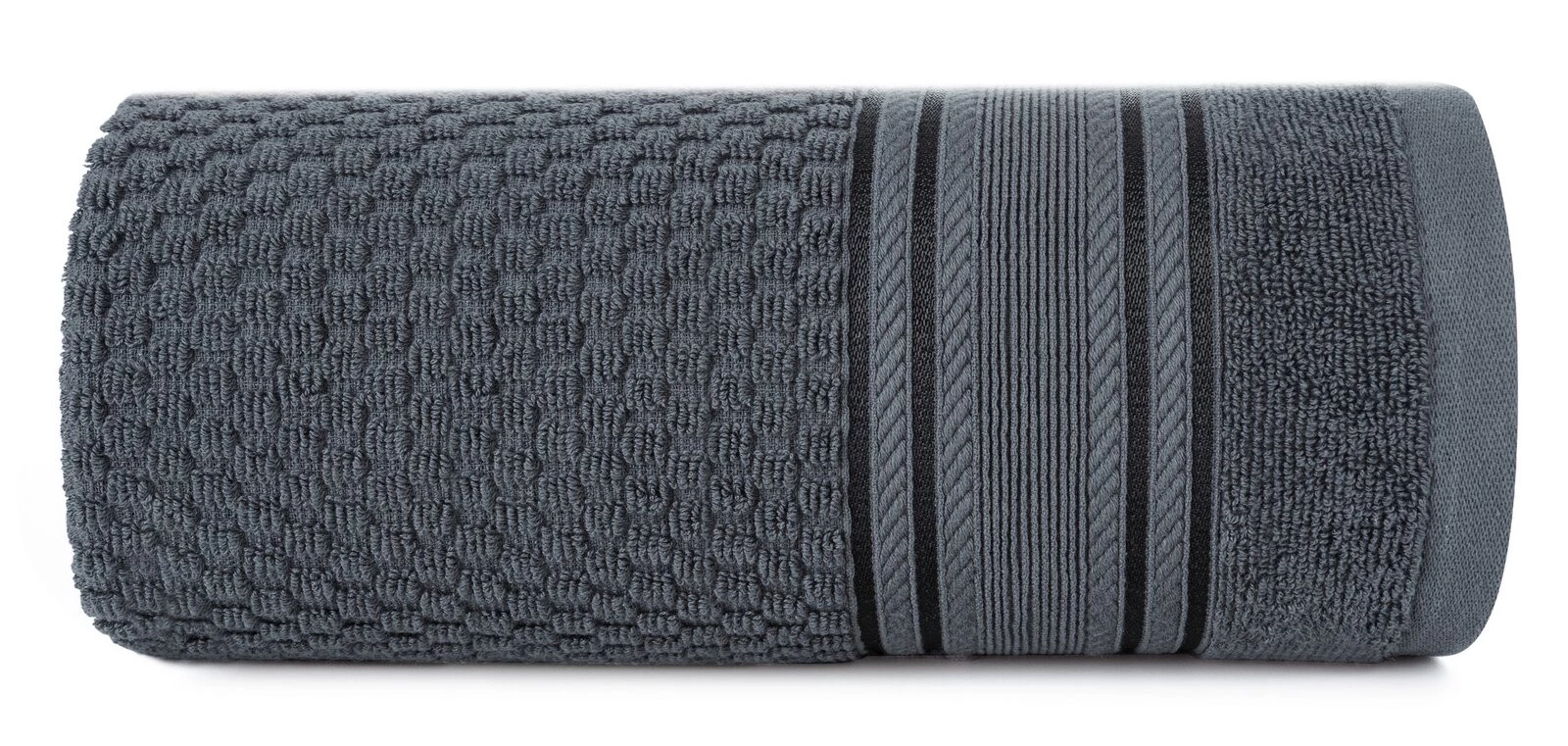 Jednobarwny ręcznik z miękkiej i chłonnej tkaniny bawełnianej o splocie frotte zdobiony kolorową bordiurą w stylu fastrygi. Łatwy w praniu, nie farbuje. szerokość: 30 cm, długość: 50 cm, kolor: stalowy, Gramatura: 500 GSM, Skład: 100% bawełna
