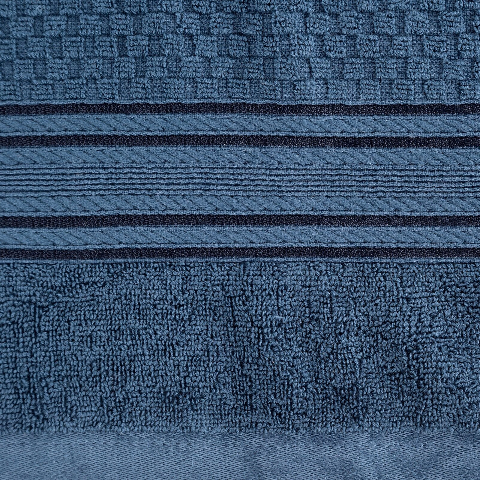 Jednobarwny ręcznik z miękkiej i chłonnej tkaniny bawełnianej o splocie frotte zdobiony kolorową bordiurą w stylu fastrygi. Łatwy w praniu, nie farbuje. szerokość: 70 cm, długość: 140 cm, kolor: granatowy, Gramatura: 500 GSM, Skład: 100% bawełna
