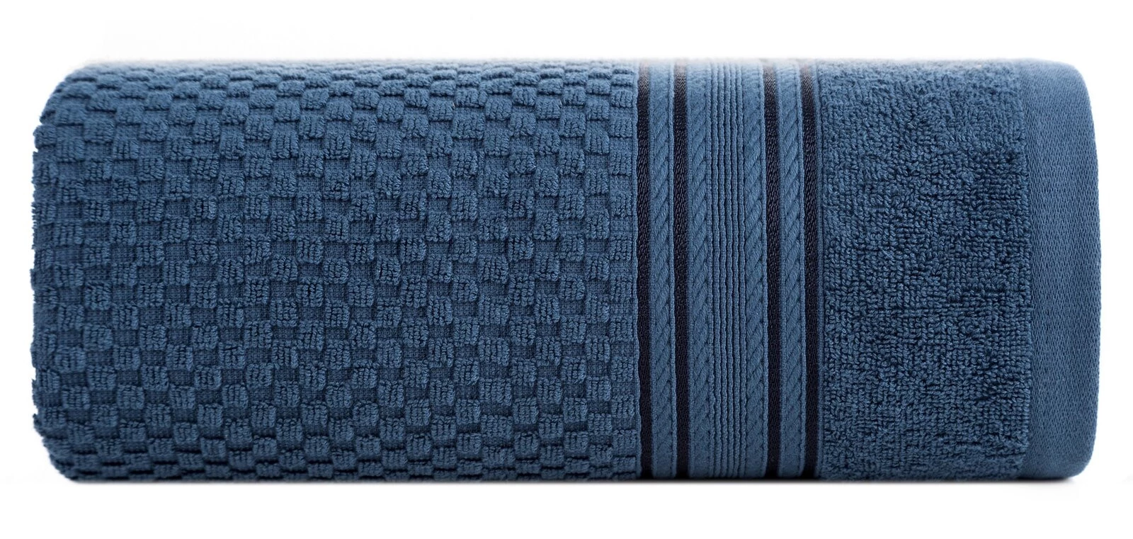Jednobarwny ręcznik z miękkiej i chłonnej tkaniny bawełnianej o splocie frotte zdobiony kolorową bordiurą w stylu fastrygi. Łatwy w praniu, nie farbuje. szerokość: 50 cm, długość: 90 cm, kolor: granatowy, Gramatura: 500 GSM, Skład: 100% bawełna