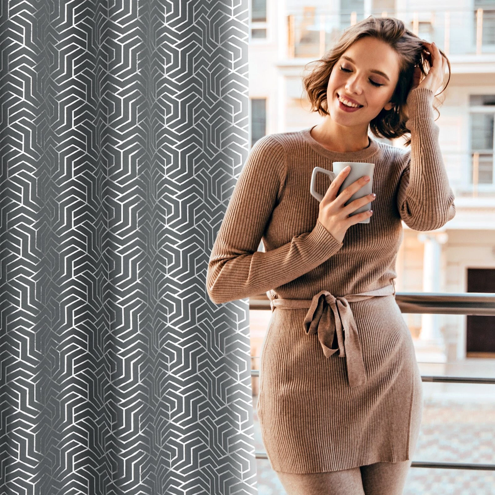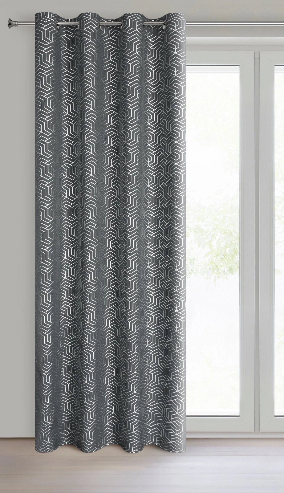 - Zasłona gotowa z nadrukiem błyszczącym szerokość: 140 cm, długość: 250 cm, kolor: stalowy, Gramatura: 140 GSM, Skład: 100% poliester