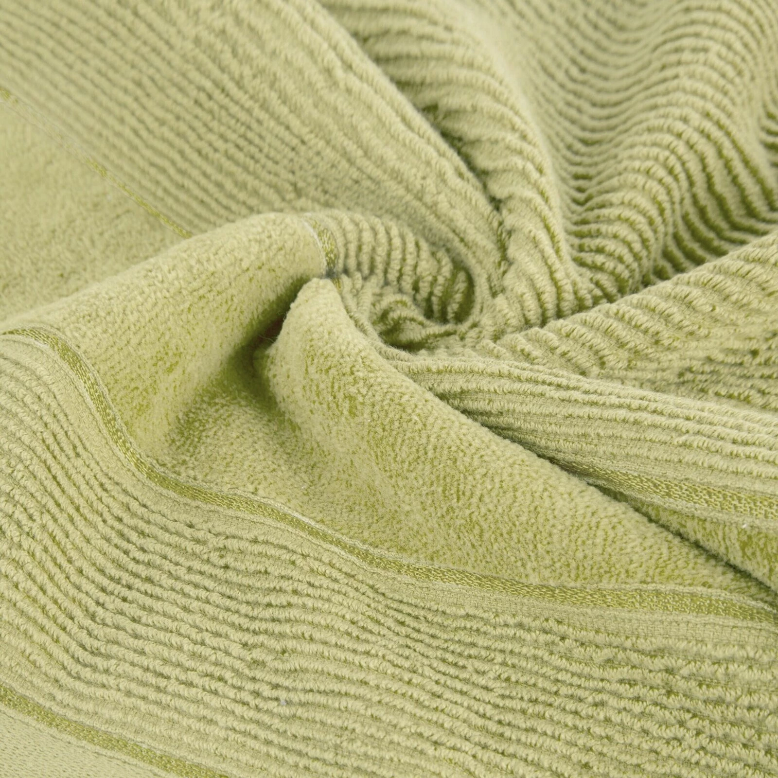 Ręcznik bawełniany o strukturze w prążki z welurową bordiurą szerokość: 70 cm, długość: 140 cm, kolor: oliwkowy, Gramatura: 500 GSM, Skład: 100% bawełna