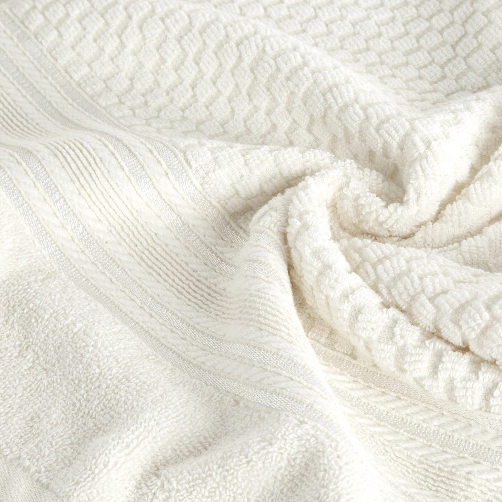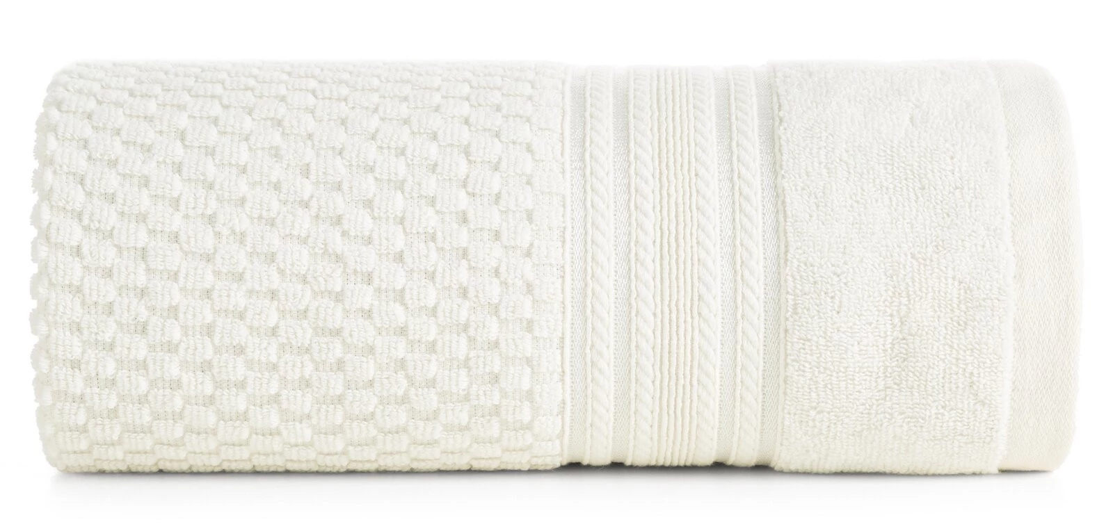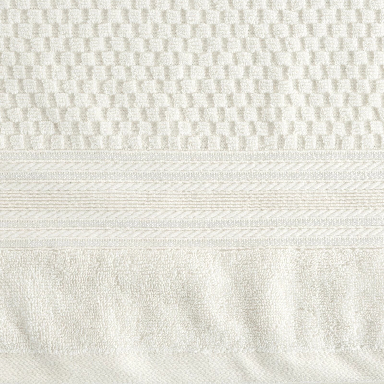 Jednobarwny ręcznik z miękkiej i chłonnej tkaniny bawełnianej o splocie frotte zdobiony kolorową bordiurą w stylu fastrygi. Łatwy w praniu, nie farbuje. szerokość: 50 cm, długość: 90 cm, kolor: kremowy, Gramatura: 500 GSM, Skład: 100% bawełna