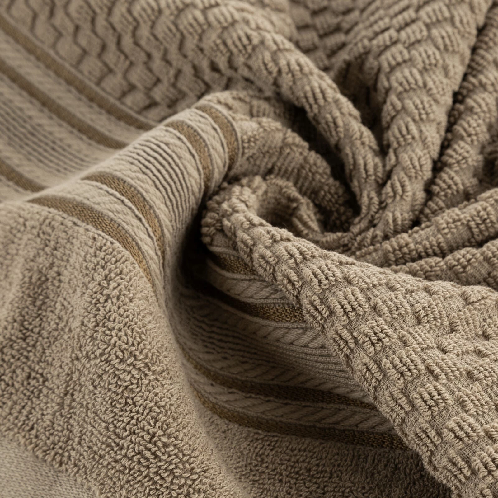 Jednobarwny ręcznik z miękkiej i chłonnej tkaniny bawełnianej o splocie frotte zdobiony kolorową bordiurą w stylu fastrygi. Łatwy w praniu, nie farbuje. szerokość: 30 cm, długość: 50 cm, kolor: beżowy, Gramatura: 500 GSM, Skład: 100% bawełna