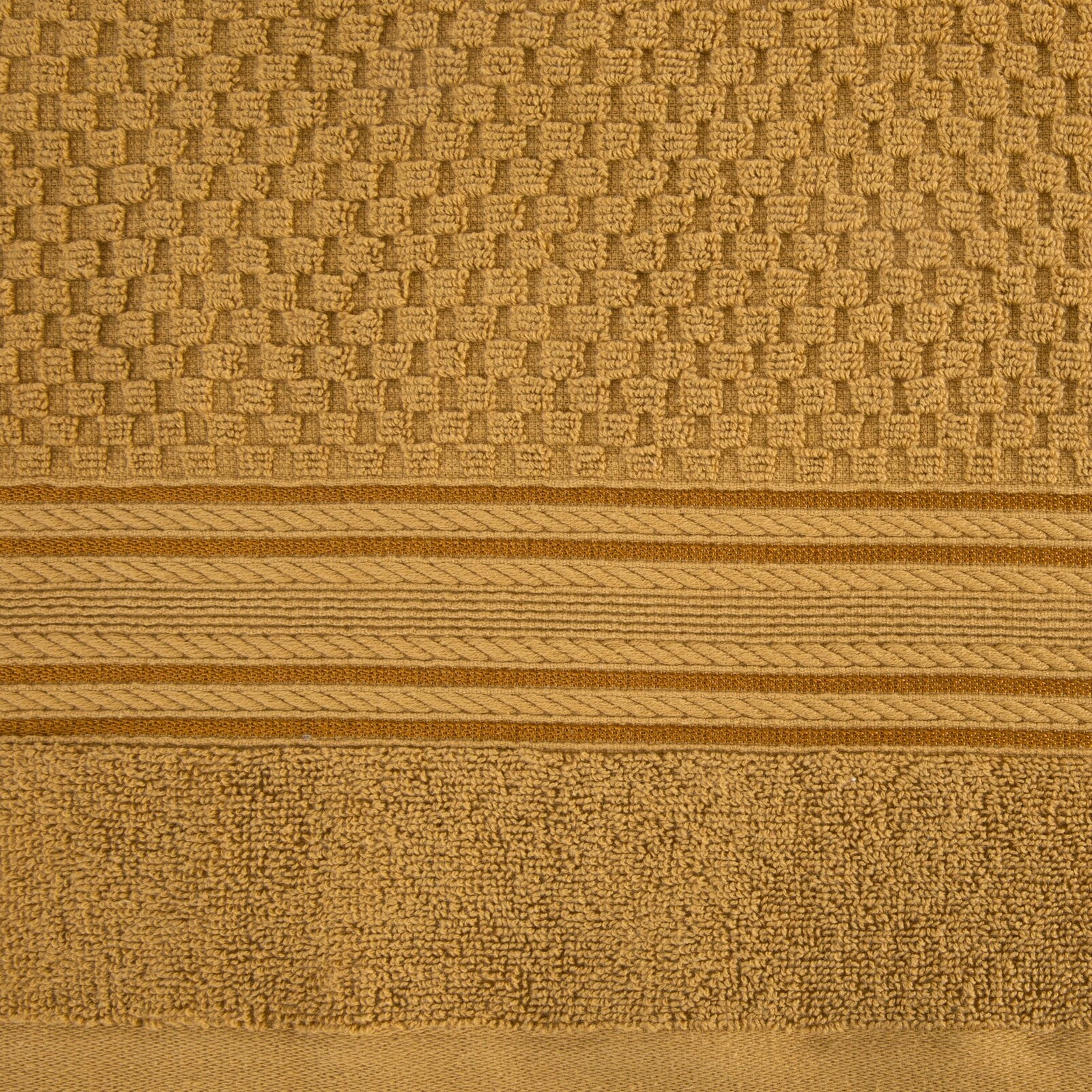 Jednobarwny ręcznik z miękkiej i chłonnej tkaniny bawełnianej o splocie frotte zdobiony kolorową bordiurą w stylu fastrygi. Łatwy w praniu, nie farbuje. szerokość: 50 cm, długość: 90 cm, kolor: miodowy, Gramatura: 500 GSM, Skład: 100% bawełna