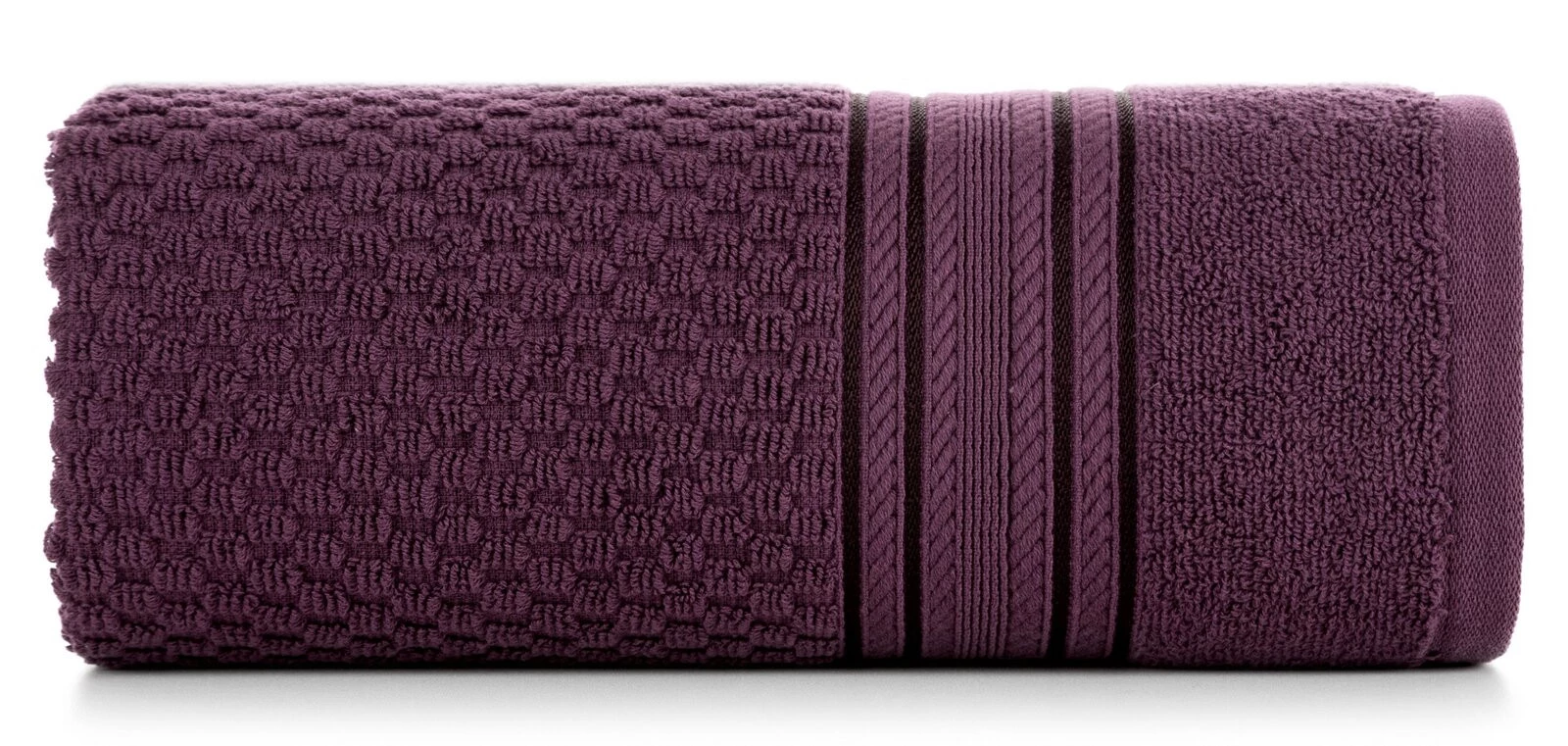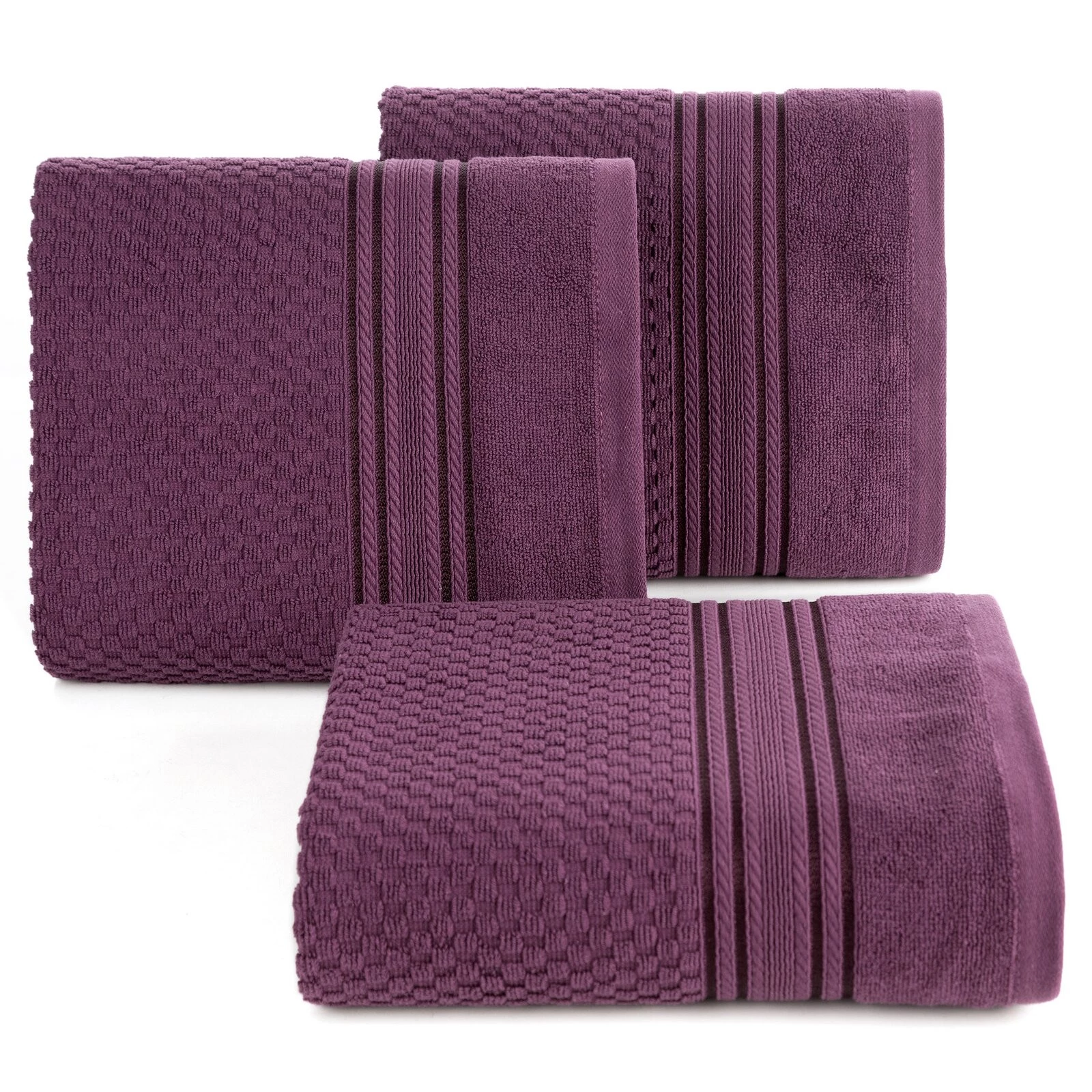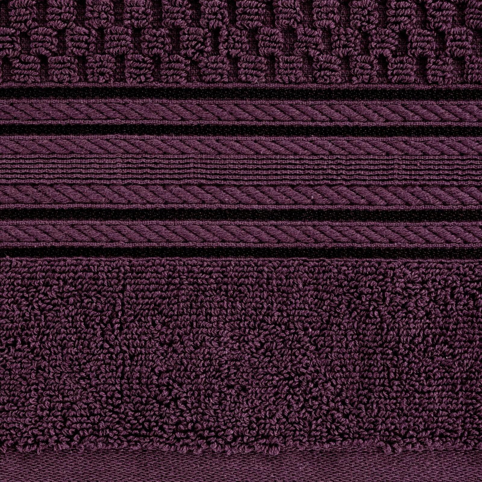 Jednobarwny ręcznik z miękkiej i chłonnej tkaniny bawełnianej o splocie frotte zdobiony kolorową bordiurą w stylu fastrygi. Łatwy w praniu, nie farbuje. szerokość: 70 cm, długość: 140 cm, kolor: ciemnofioletowy, Gramatura: 500 GSM, Skład: 100% bawełna