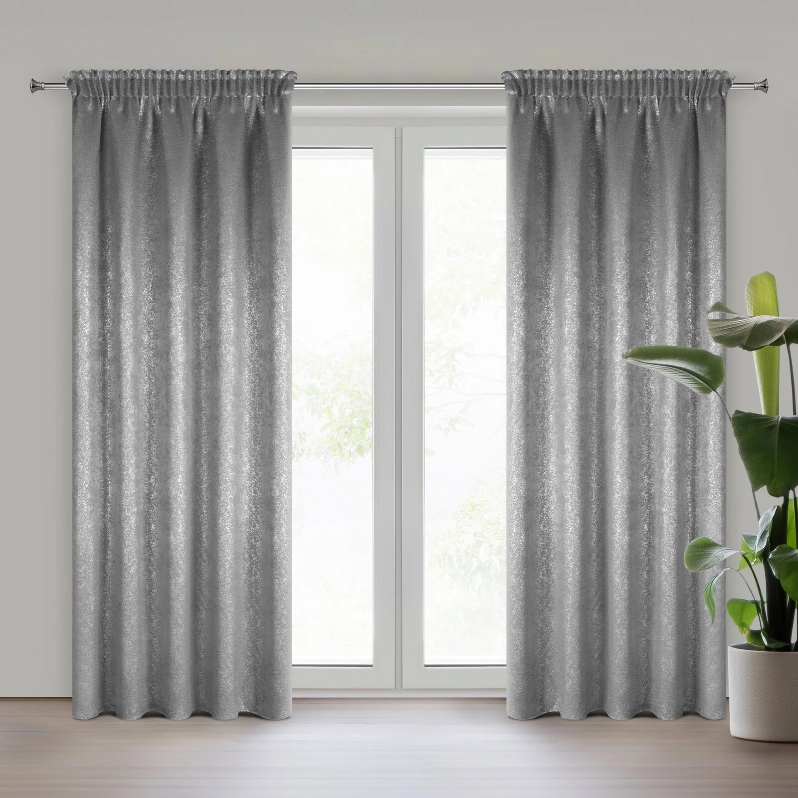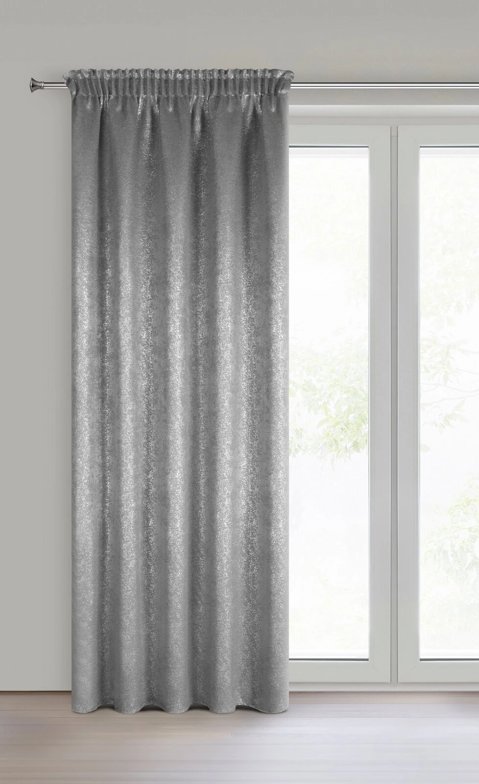 - Efektowna zasłona doskonale izoluje wnetrze i choni przed nadmiarem światła. Pokryta srebrnym nadrukiem świetnie wygląda w stylu glamour. szerokość: 135 cm, długość: 270 cm, kolor: stalowy, Gramatura: 230 GSM, Skład: 100% poliester