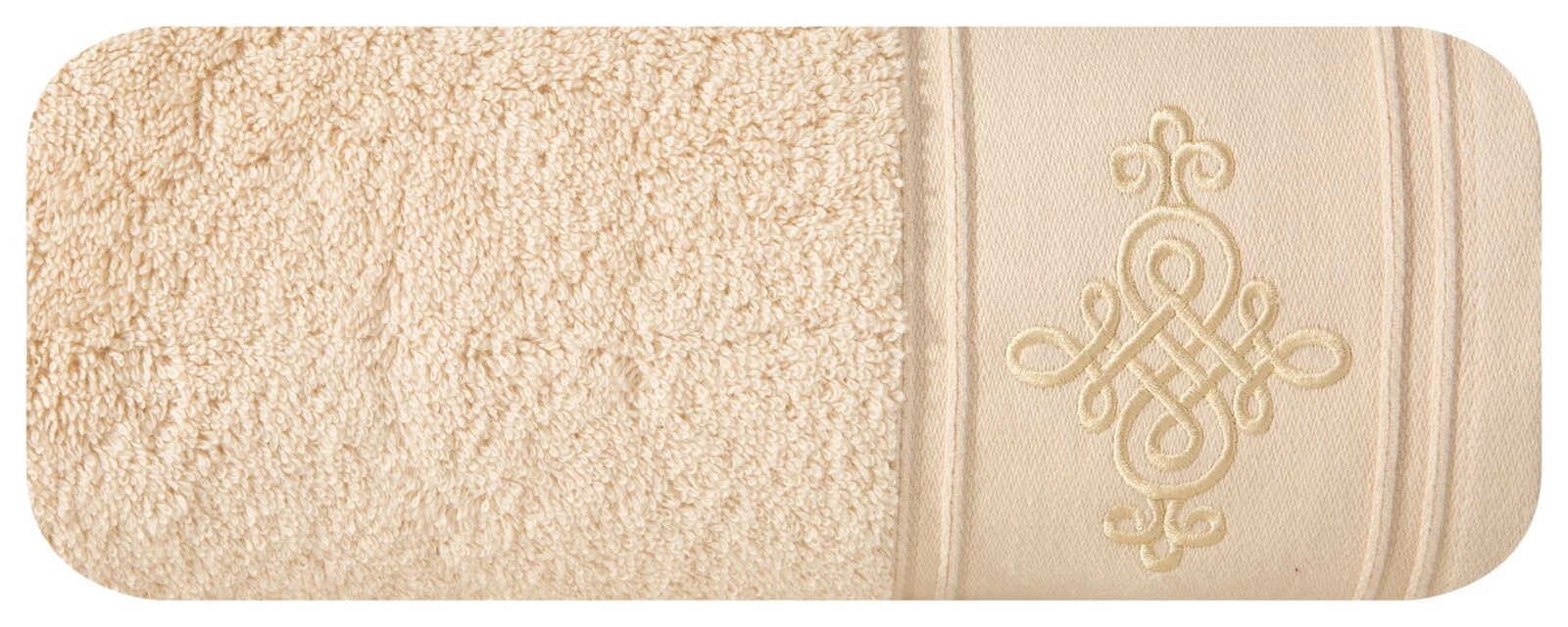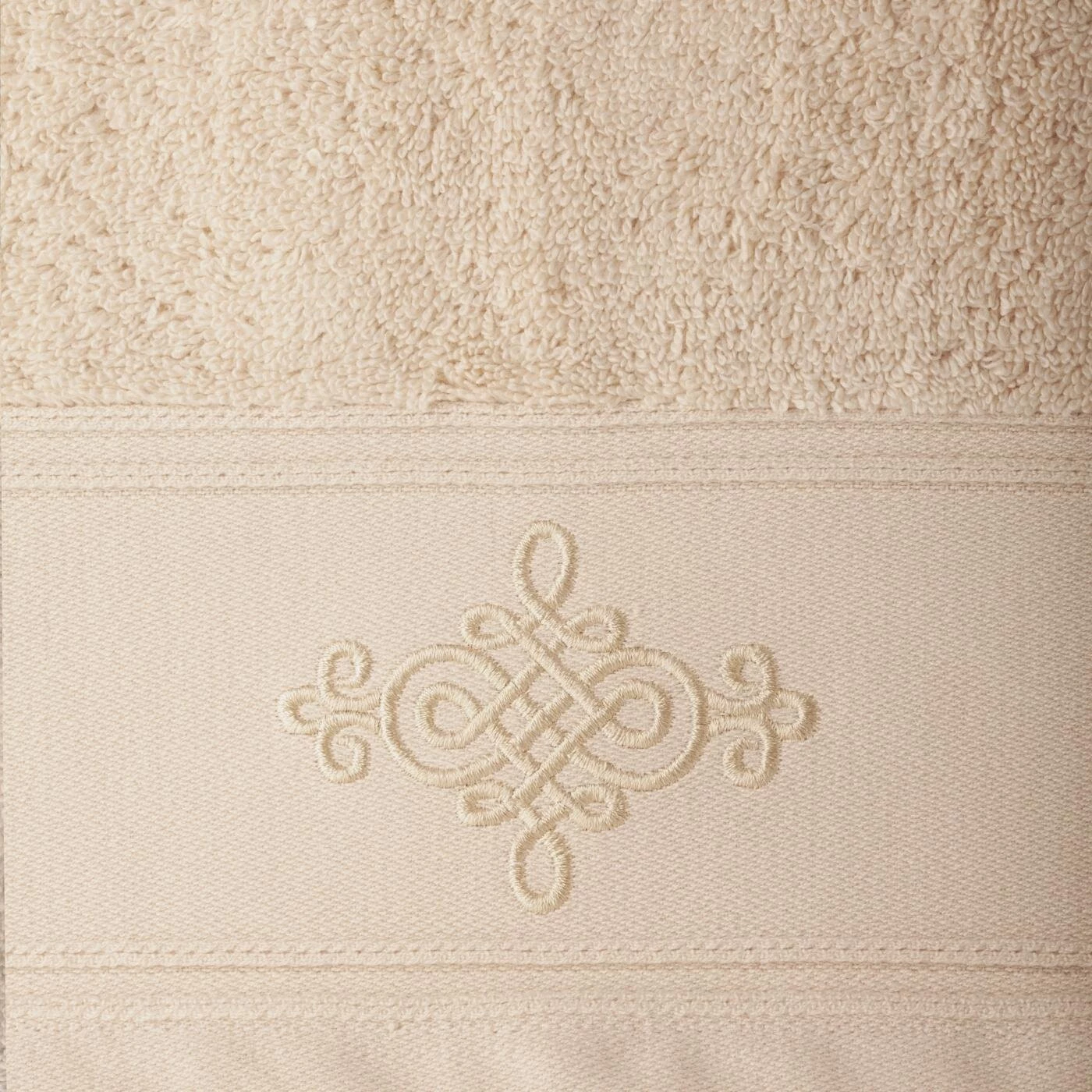 Bawełniany ręcznik z miękkiej tkaniny o splocie frotte i wyjątkowej chłonności. Szeroka bordiura ozdobiona jest klasycznym ornamentem. Kolory odporne na pranie. szerokość: 70 cm, długość: 140 cm, kolor: beżowy, Gramatura: 600 GSM, Skład: 100% bawełna