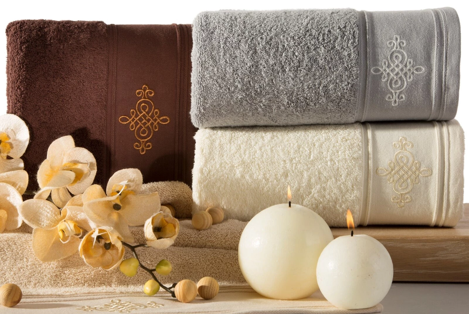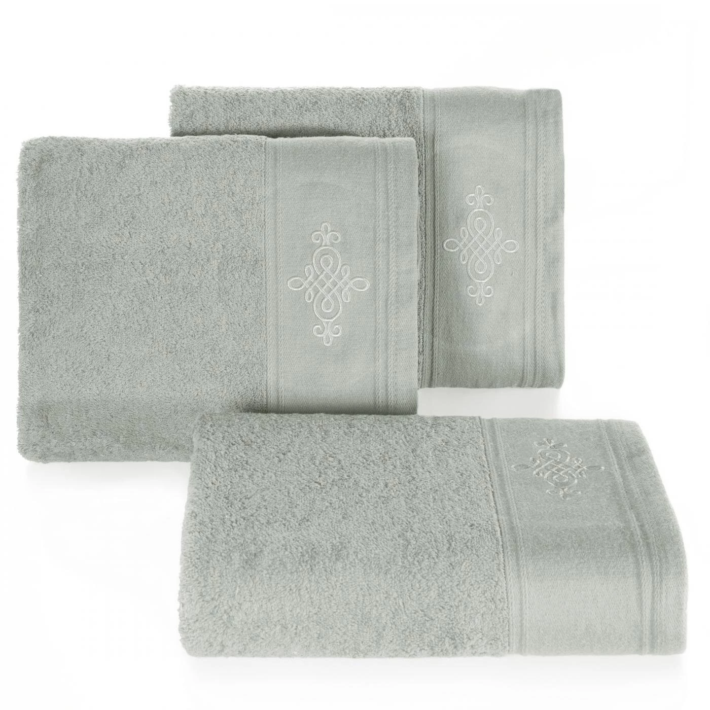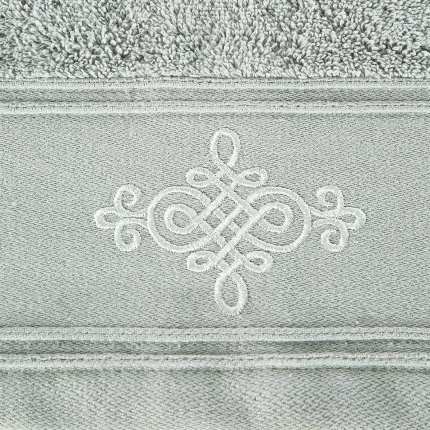 Bawełniany ręcznik z miękkiej tkaniny o splocie frotte i wyjątkowej chłonności. Szeroka bordiura ozdobiona jest klasycznym ornamentem. Kolory odporne na pranie. szerokość: 70 cm, długość: 140 cm, kolor: srebrny, Gramatura: 600 GSM, Skład: 100% bawełna