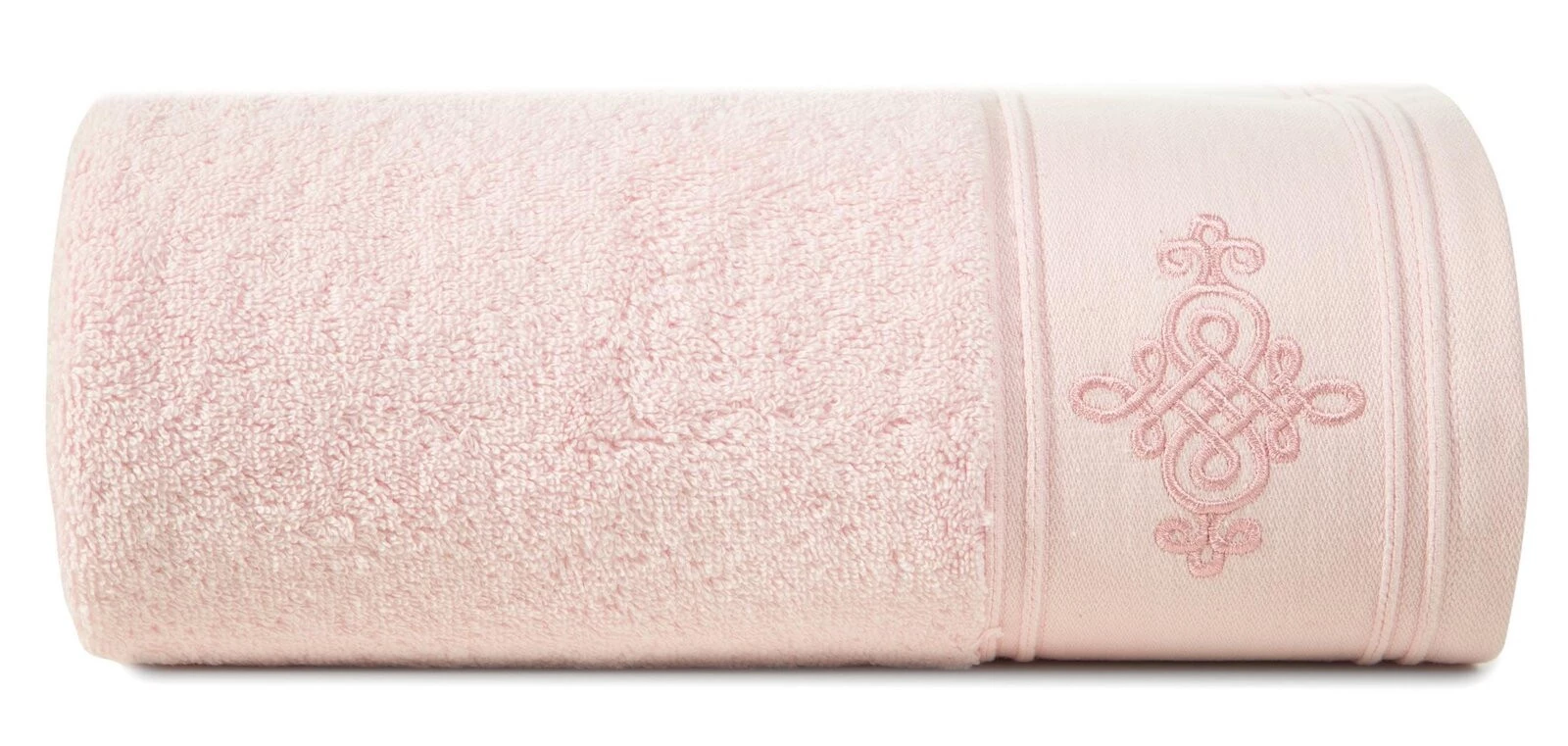 Bawełniany ręcznik z miękkiej tkaniny o splocie frotte i wyjątkowej chłonności. Szeroka bordiura ozdobiona jest klasycznym ornamentem. Kolory odporne na pranie. szerokość: 70 cm, długość: 140 cm, kolor: różowy, Gramatura: 600 GSM, Skład: 100% bawełna