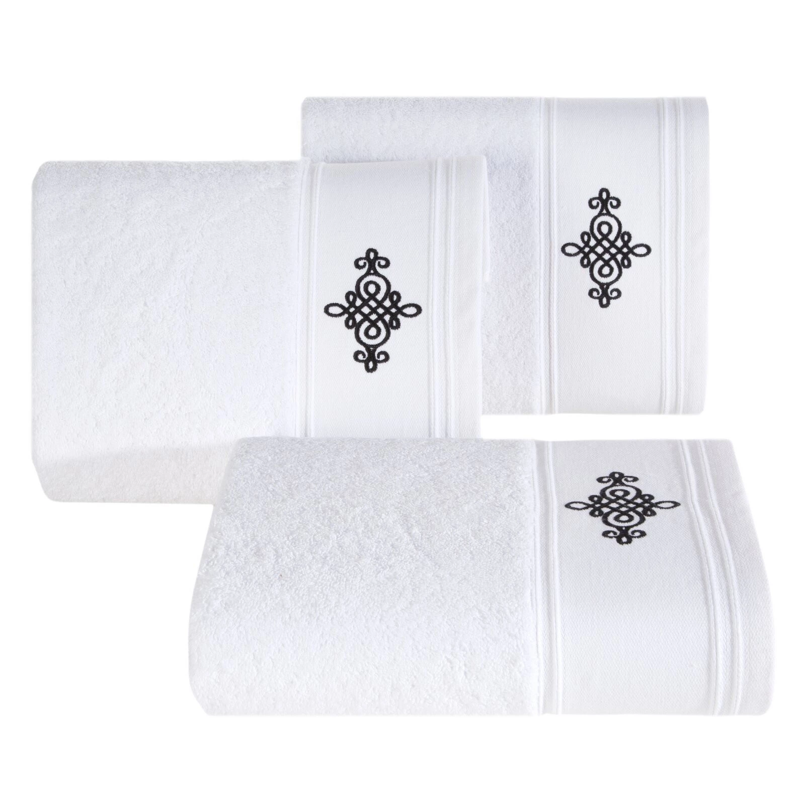 Bawełniany ręcznik z miękkiej tkaniny o splocie frotte i wyjątkowej chłonności. Szeroka bordiura ozdobiona jest klasycznym ornamentem. Kolory odporne na pranie. szerokość: 50 cm, długość: 90 cm, kolor: biały, Gramatura: 600 GSM, Skład: 100% bawełna