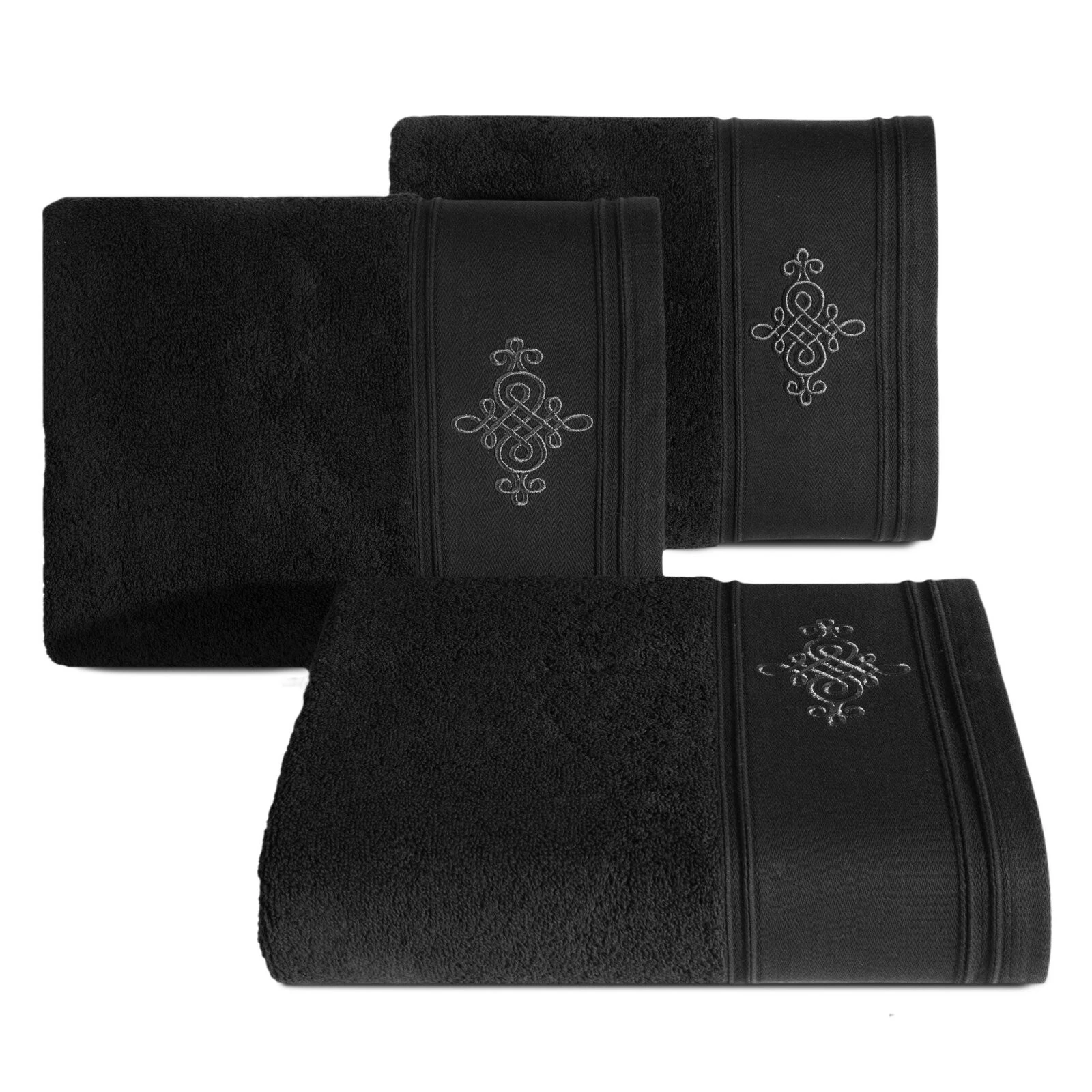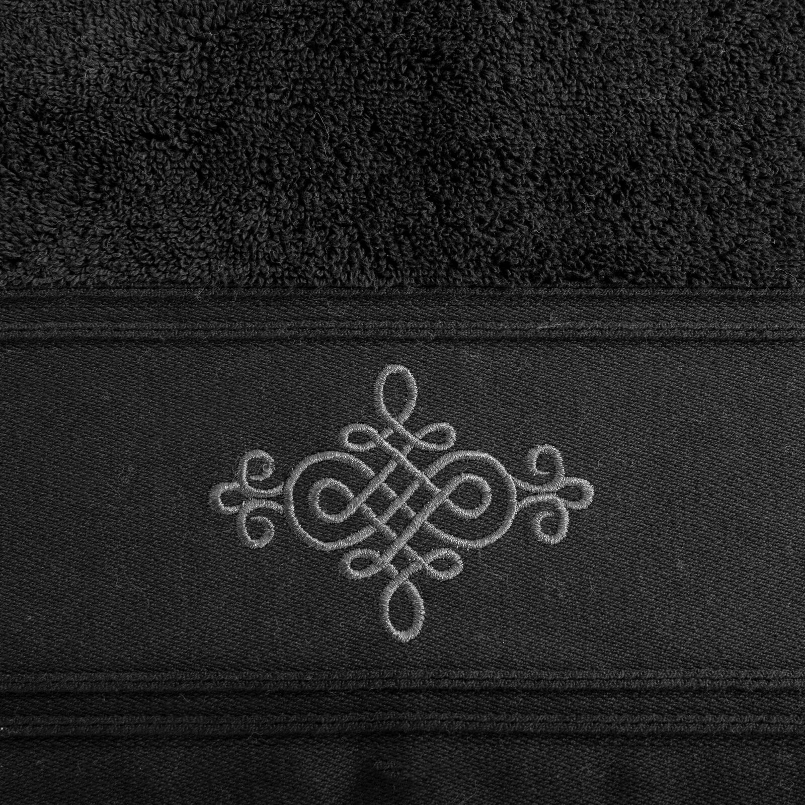 Bawełniany ręcznik z miękkiej tkaniny o splocie frotte i wyjątkowej chłonności. Szeroka bordiura ozdobiona jest klasycznym ornamentem. Kolory odporne na pranie. szerokość: 50 cm, długość: 90 cm, kolor: czarny, Gramatura: 600 GSM, Skład: 100% bawełna