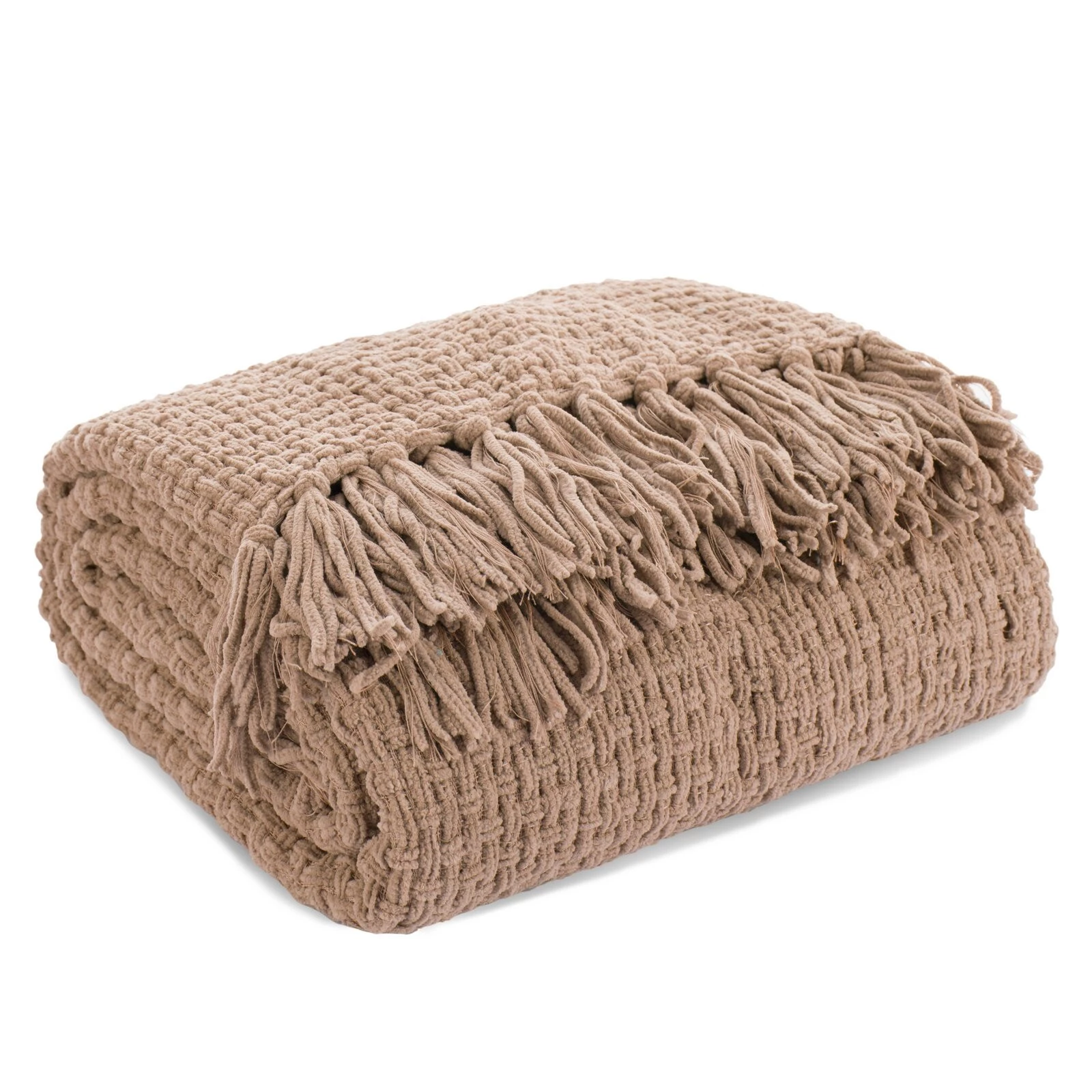 Tkany koc z frędzlami szerokość: 130 cm, długość: 170 cm, kolor: ciemnobeżowy, Gramatura: 380 GSM, Skład: 100% poliester