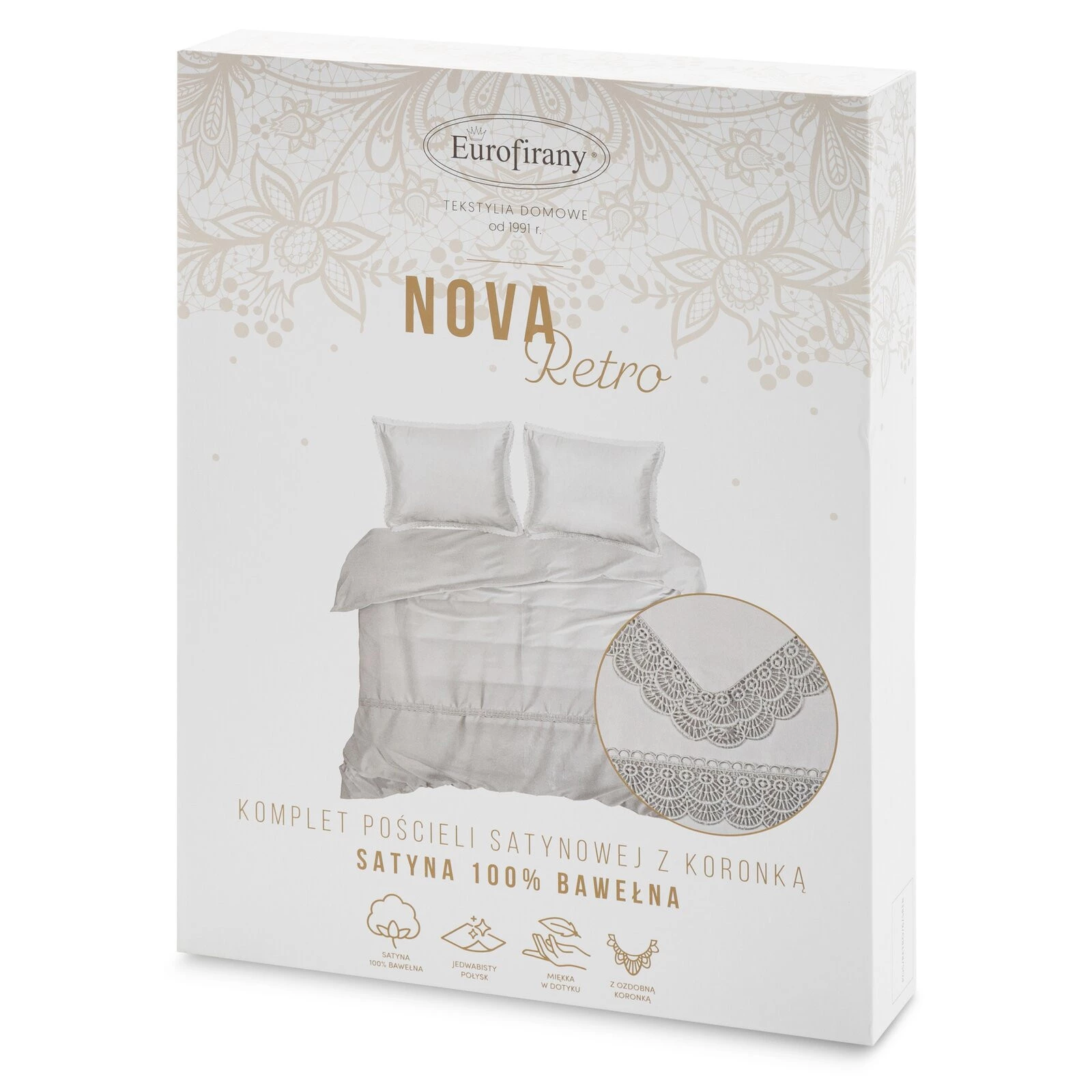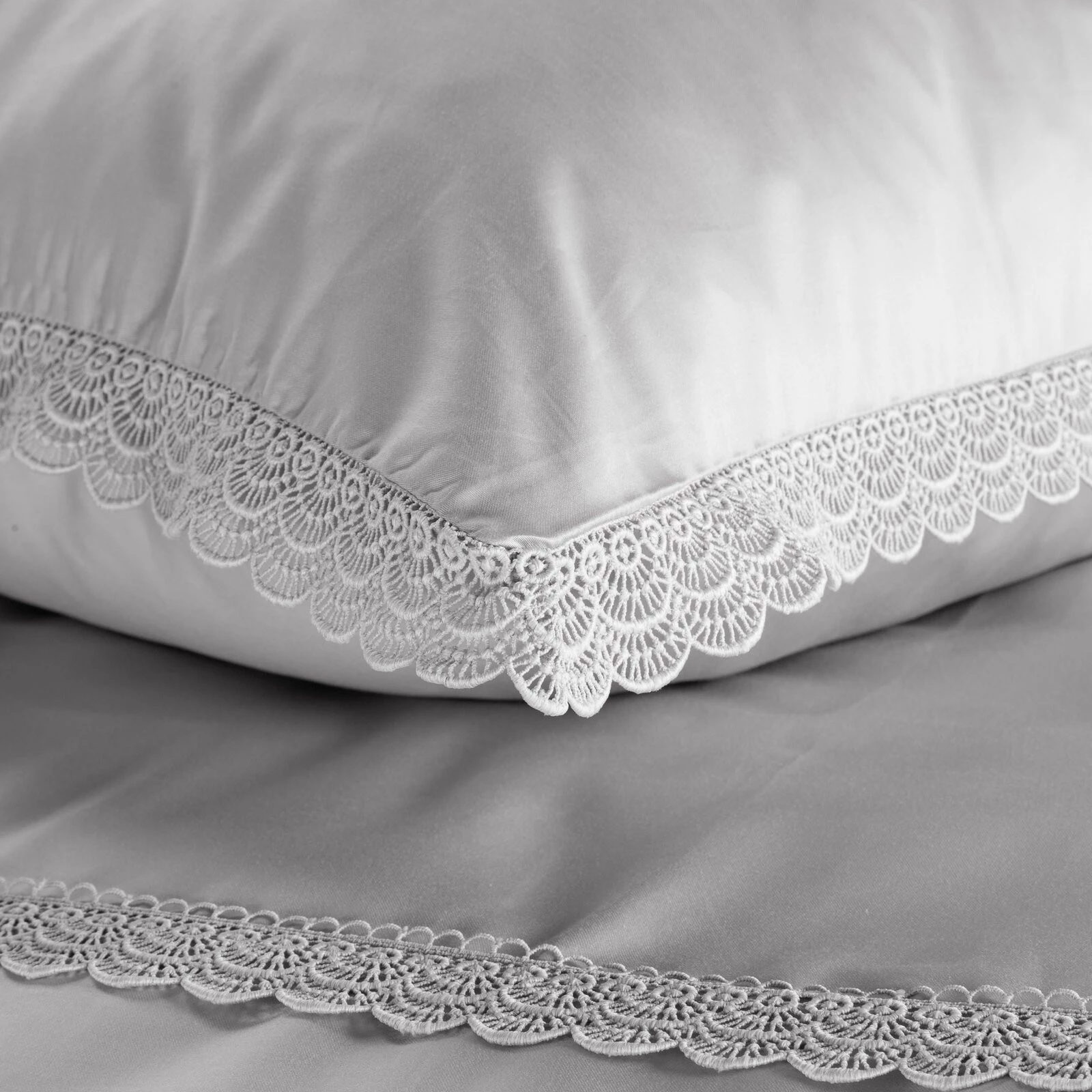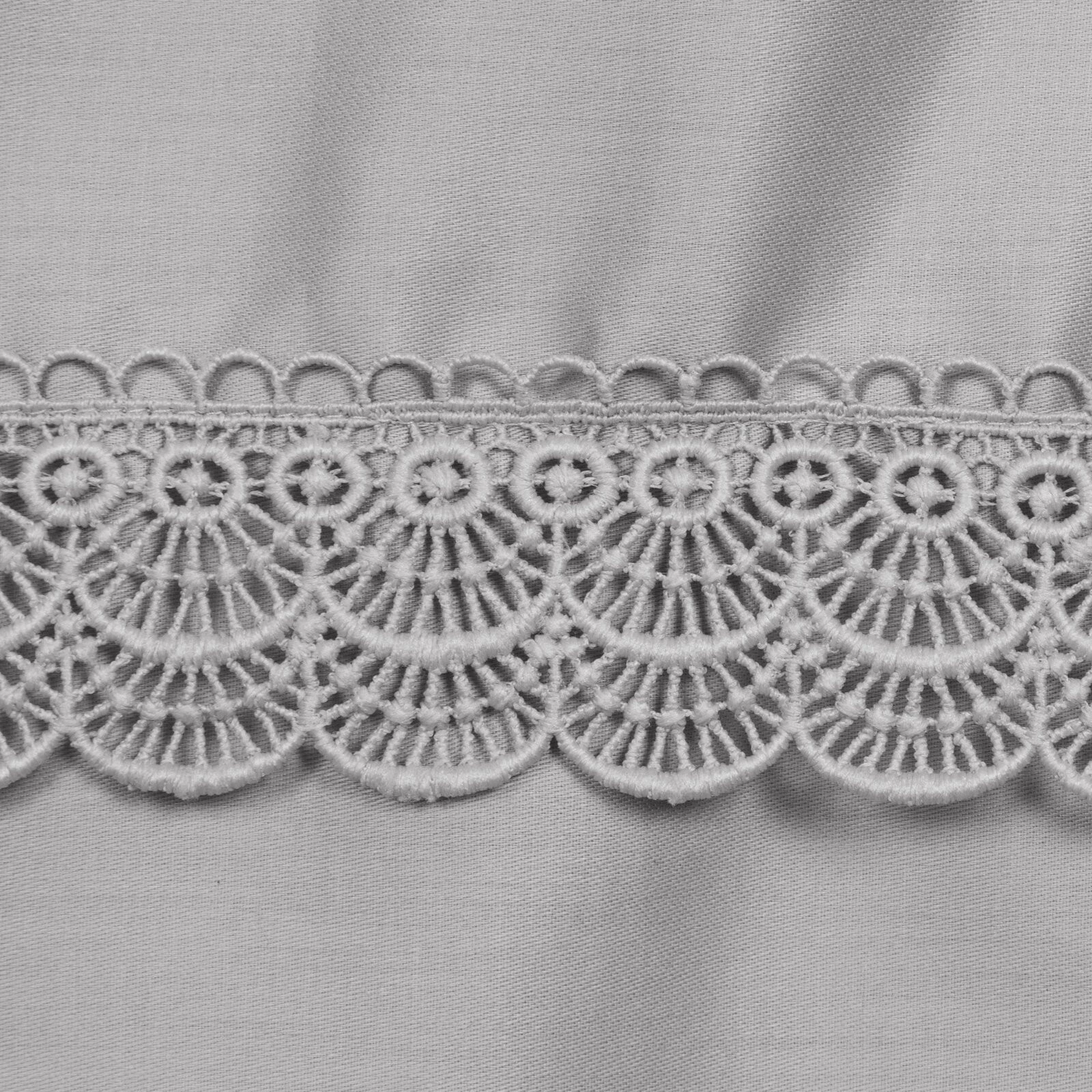 Komplet pościeli z satyny bawełnianej z koronką, pakowana w pudełku szerokość: 220 cm, długość: 200 cm, kolor: jasnoszary, Gramatura: 115 GSM, Skład: tkanina: satyna, 100% bawełna; część ozdobna (koronka): 100% poliester