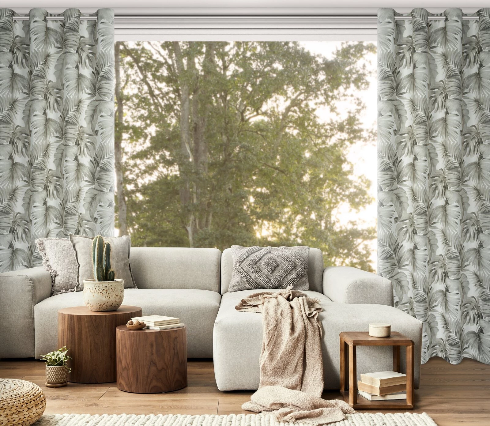 - Zasłona gotowa zaciemniająca z motywem liści szerokość: 140 cm, długość: 250 cm, kolor: biały, Gramatura: 190 GSM, Skład: 100% poliester