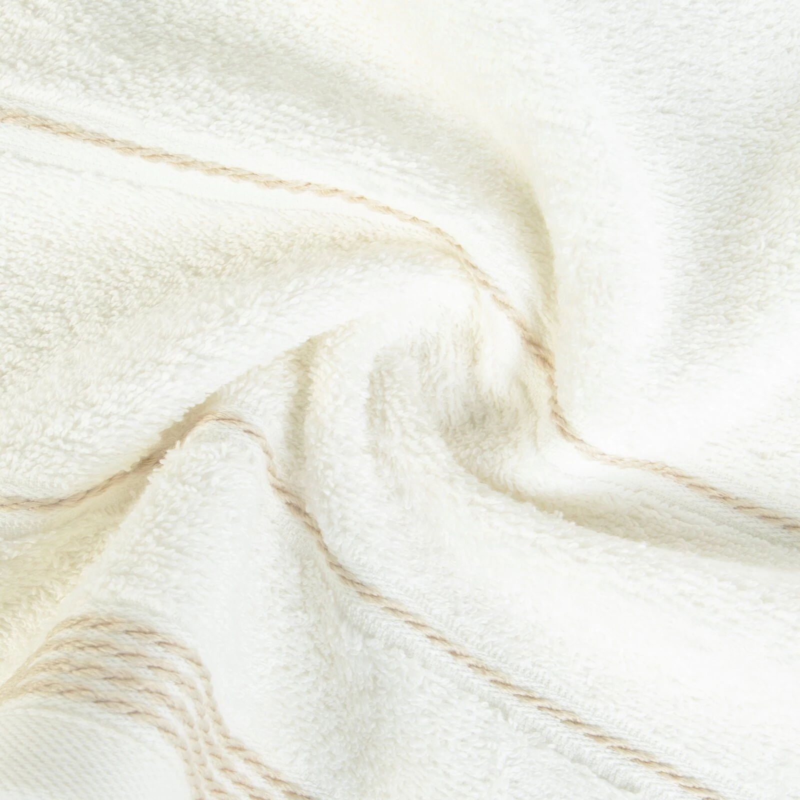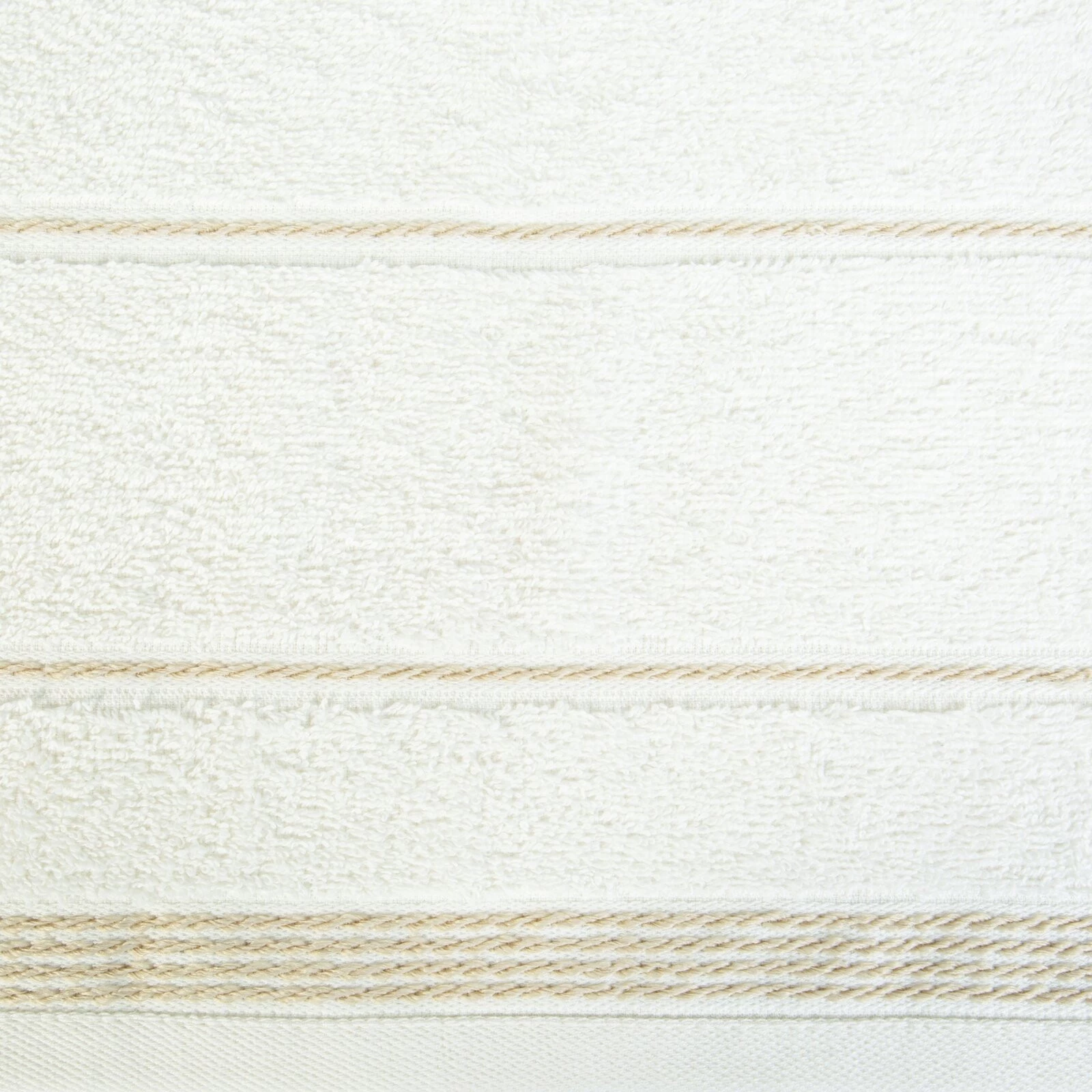 Miękki, klasyczny ręcznik kąpielowy z chłonnej tkaniny bawełnianej frotte zdobiony subtelną, elegancką bordiurą. Jednokolorowy ręcznik nie farbuje. szerokość: 30 cm, długość: 50 cm, kolor: kremowy, Gramatura: 500 GSM, Skład: 100% bawełna; część ozdobna: 60% bawełna, 40% poliester