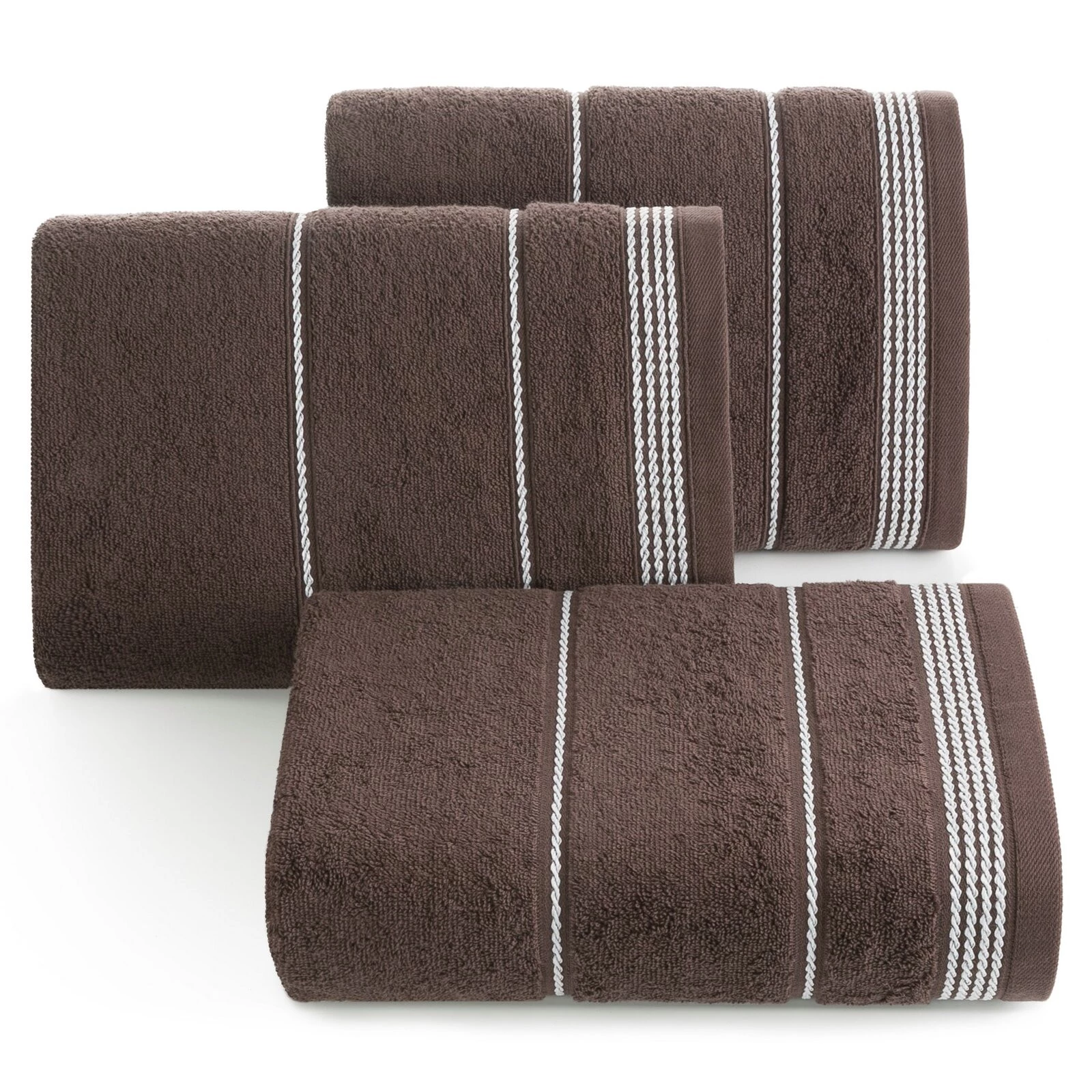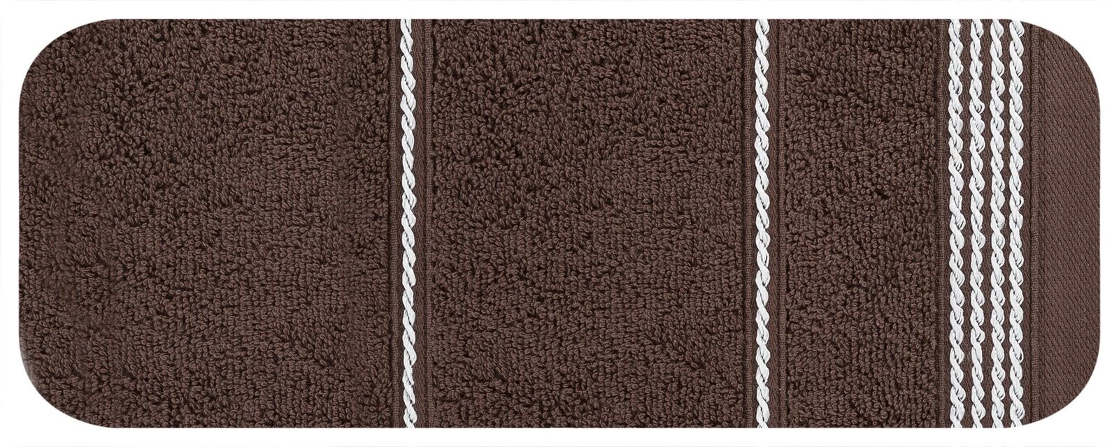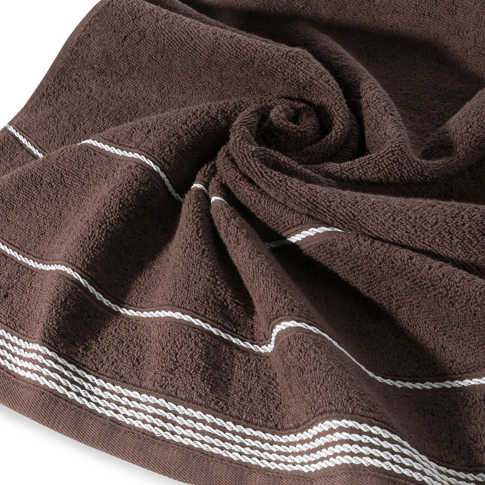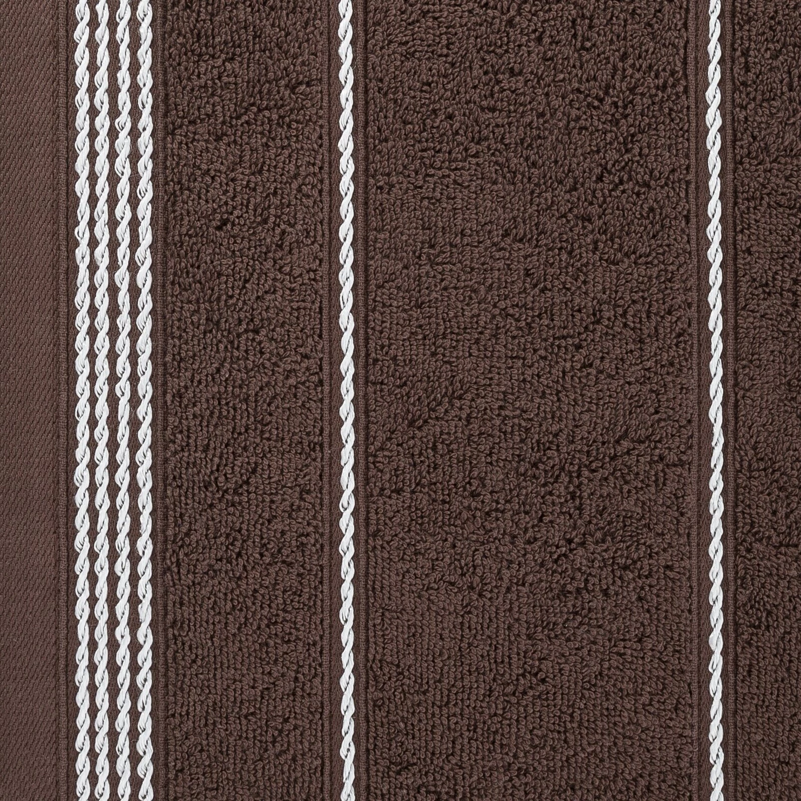 Miękki, klasyczny ręcznik kąpielowy z chłonnej tkaniny bawełnianej frotte zdobiony subtelną, elegancką bordiurą. Jednokolorowy ręcznik nie farbuje. szerokość: 30 cm, długość: 50 cm, kolor: brązowy, Gramatura: 500 GSM, Skład: 100% bawełna; część ozdobna: 60% bawełna, 40% poliester