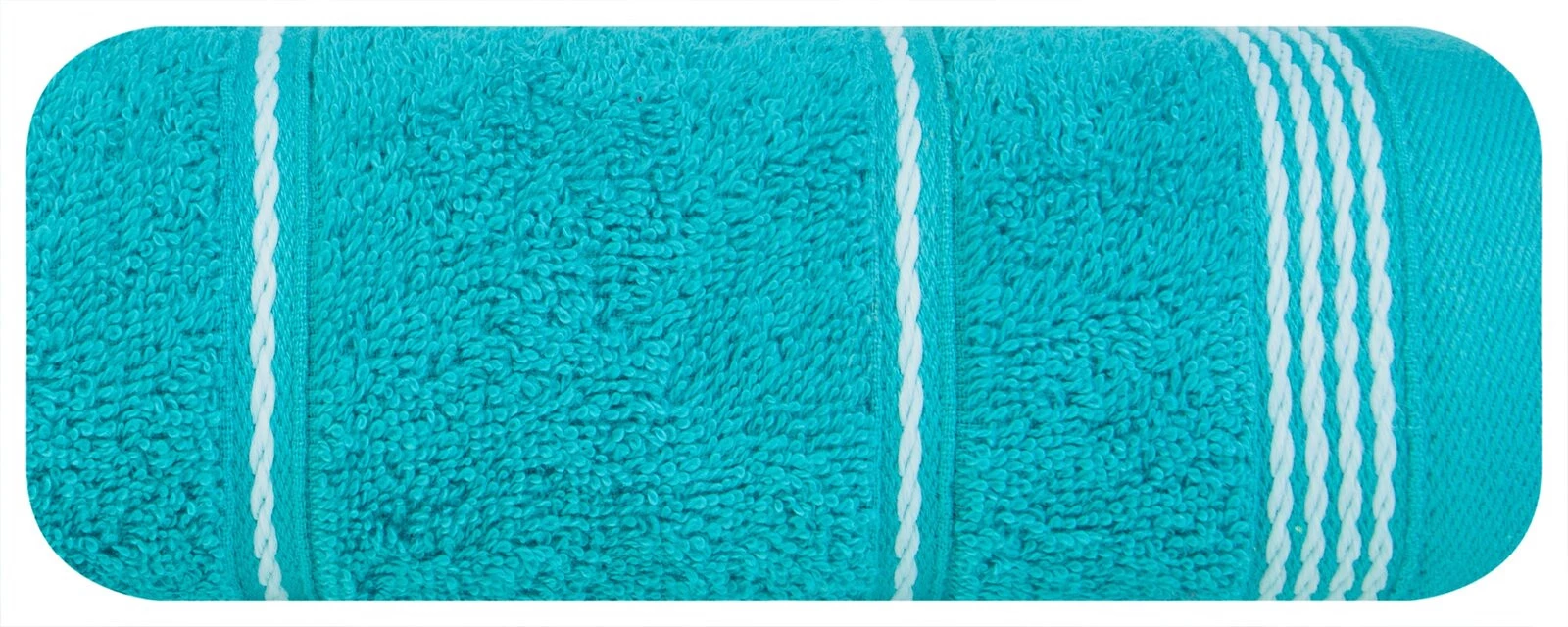 Miękki, klasyczny ręcznik kąpielowy z chłonnej tkaniny bawełnianej frotte zdobiony subtelną, elegancką bordiurą. Jednokolorowy ręcznik nie farbuje. szerokość: 30 cm, długość: 50 cm, kolor: turkusowy, Gramatura: 500 GSM, Skład: 100% bawełna; część ozdobna: 60% bawełna, 40% poliester