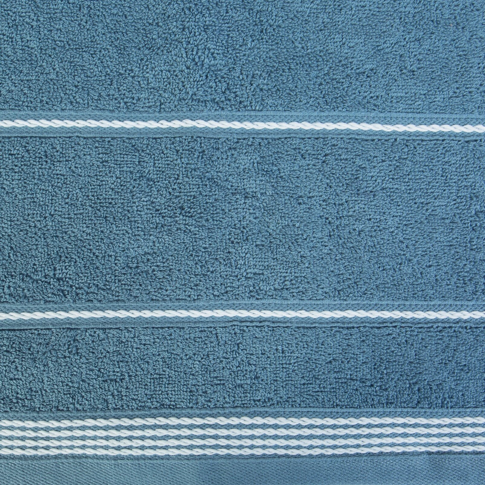 Miękki, klasyczny ręcznik kąpielowy z chłonnej tkaniny bawełnianej frotte zdobiony subtelną, elegancką bordiurą. Jednokolorowy ręcznik nie farbuje. szerokość: 30 cm, długość: 50 cm, kolor: ciemnoniebieski, Gramatura: 500 GSM, Skład: 100% bawełna; część ozdobna: 60% bawełna, 40% poliester