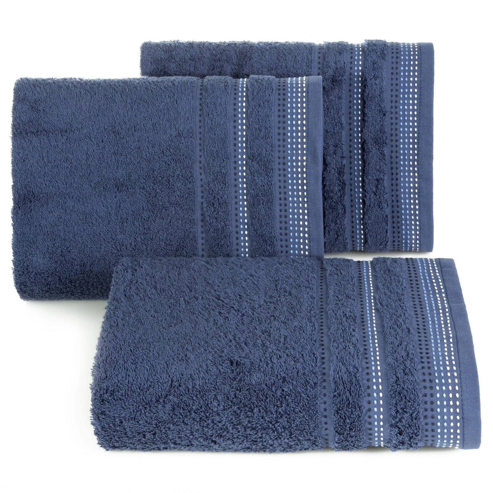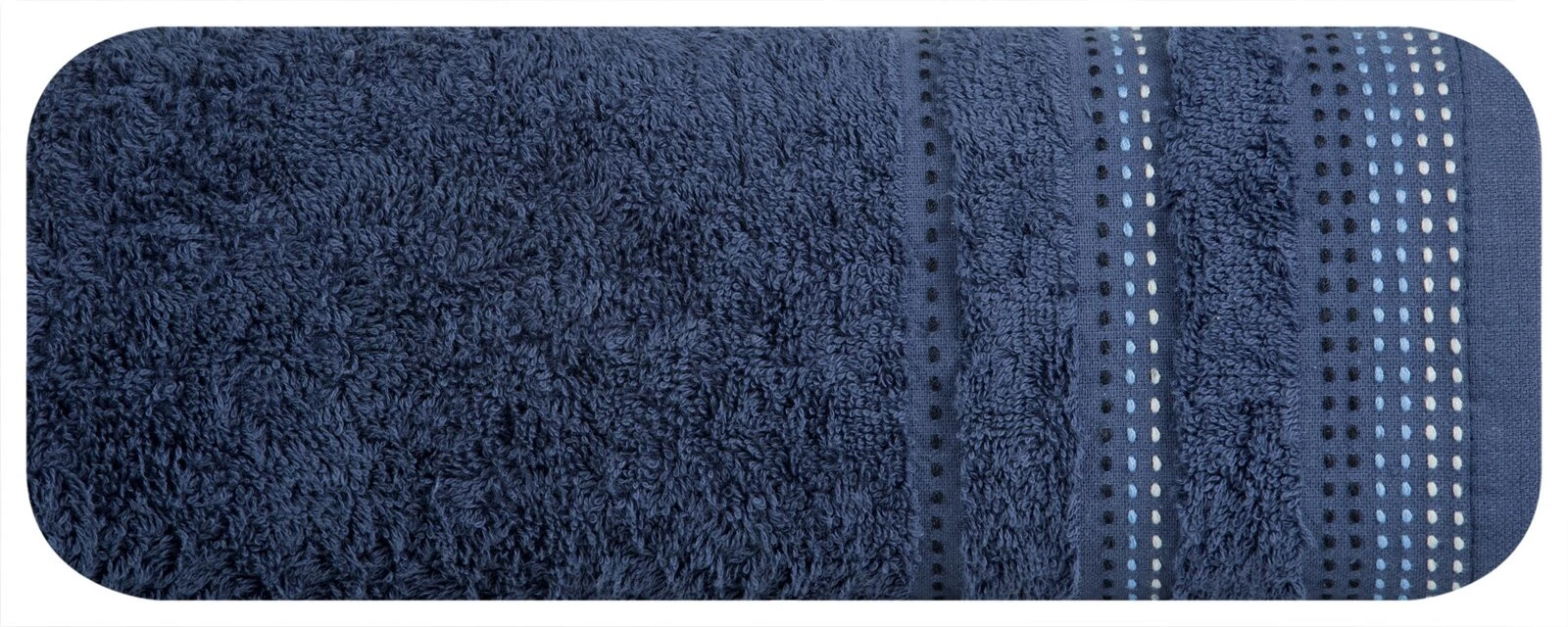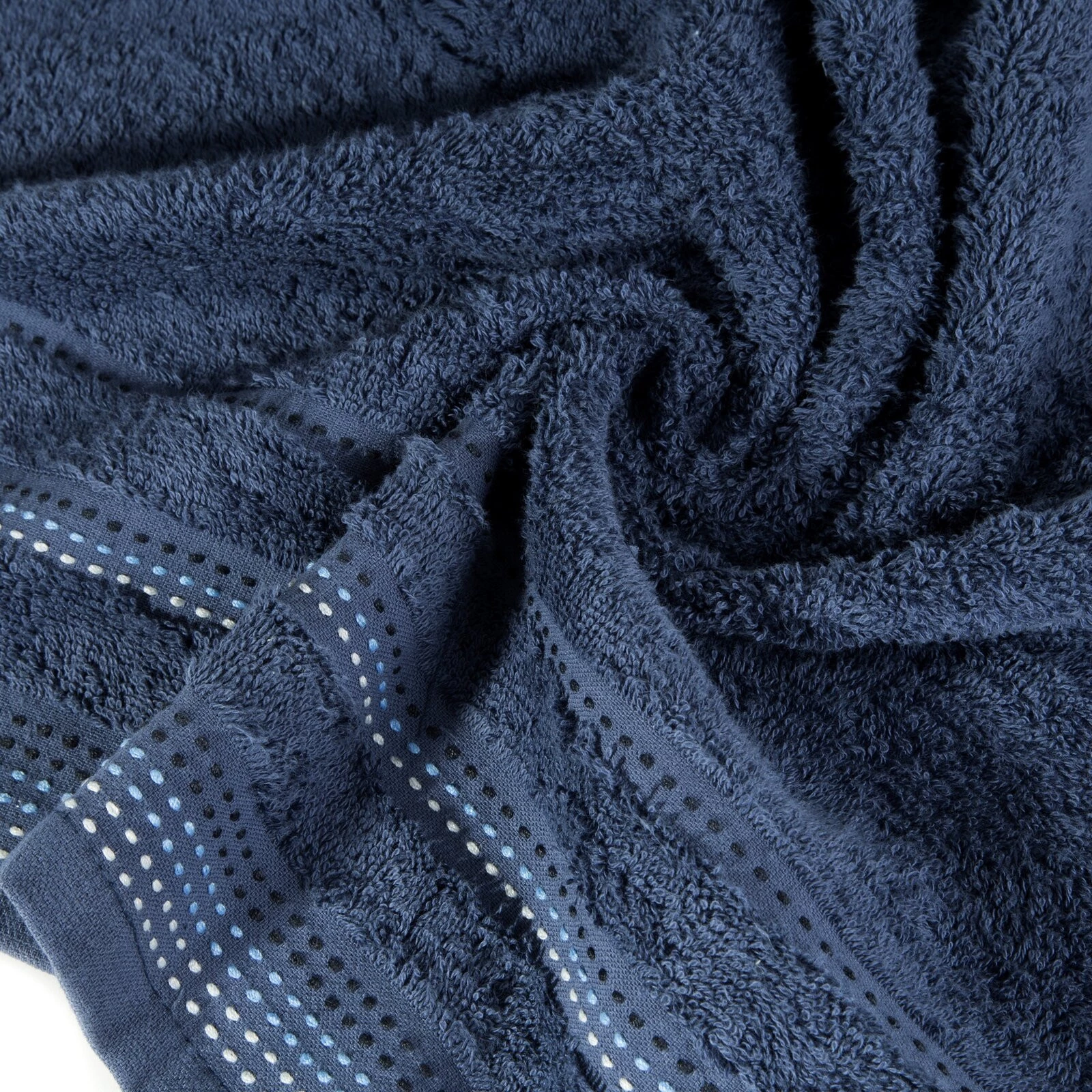 Jednobarwny ręcznik z miękkiej i chłonnej tkaniny bawełnianej o splocie frotte zdobiony kolorową bordiurą w stylu fastrygi. Łatwy w praniu, nie farbuje. szerokość: 30 cm, długość: 50 cm, kolor: granatowy, Gramatura: 500 GSM, Skład: 100% bawełna