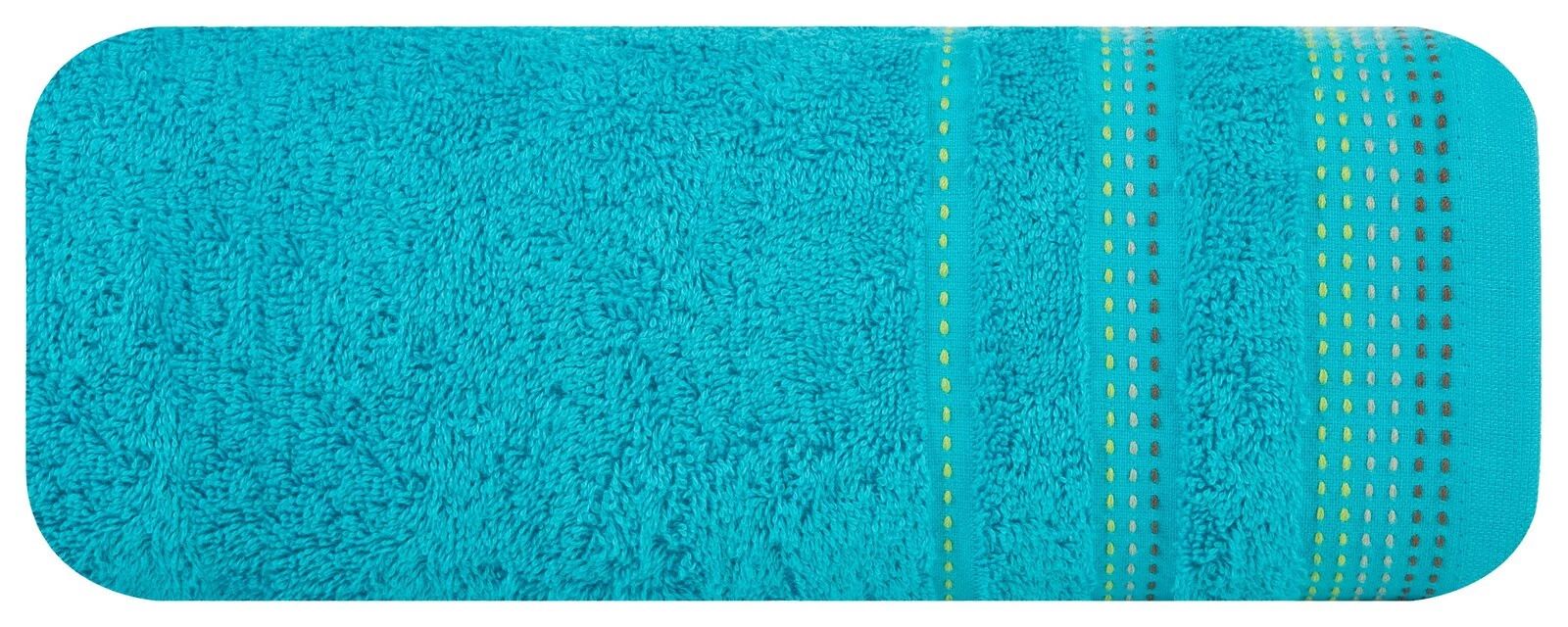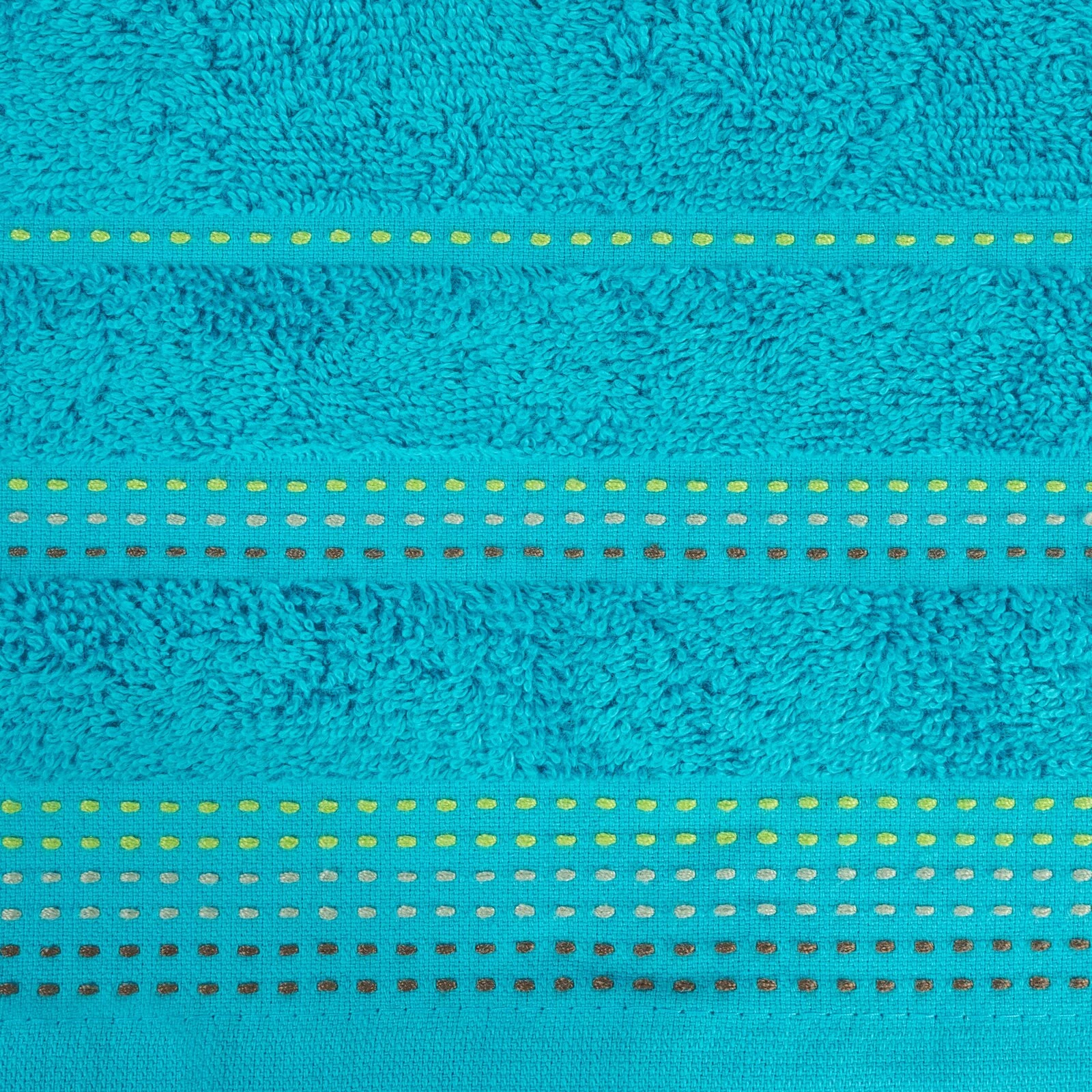 Jednobarwny ręcznik z miękkiej i chłonnej tkaniny bawełnianej o splocie frotte zdobiony kolorową bordiurą w stylu fastrygi. Łatwy w praniu, nie farbuje. szerokość: 50 cm, długość: 90 cm, kolor: turkusowy, Gramatura: 500 GSM, Skład: 100% bawełna