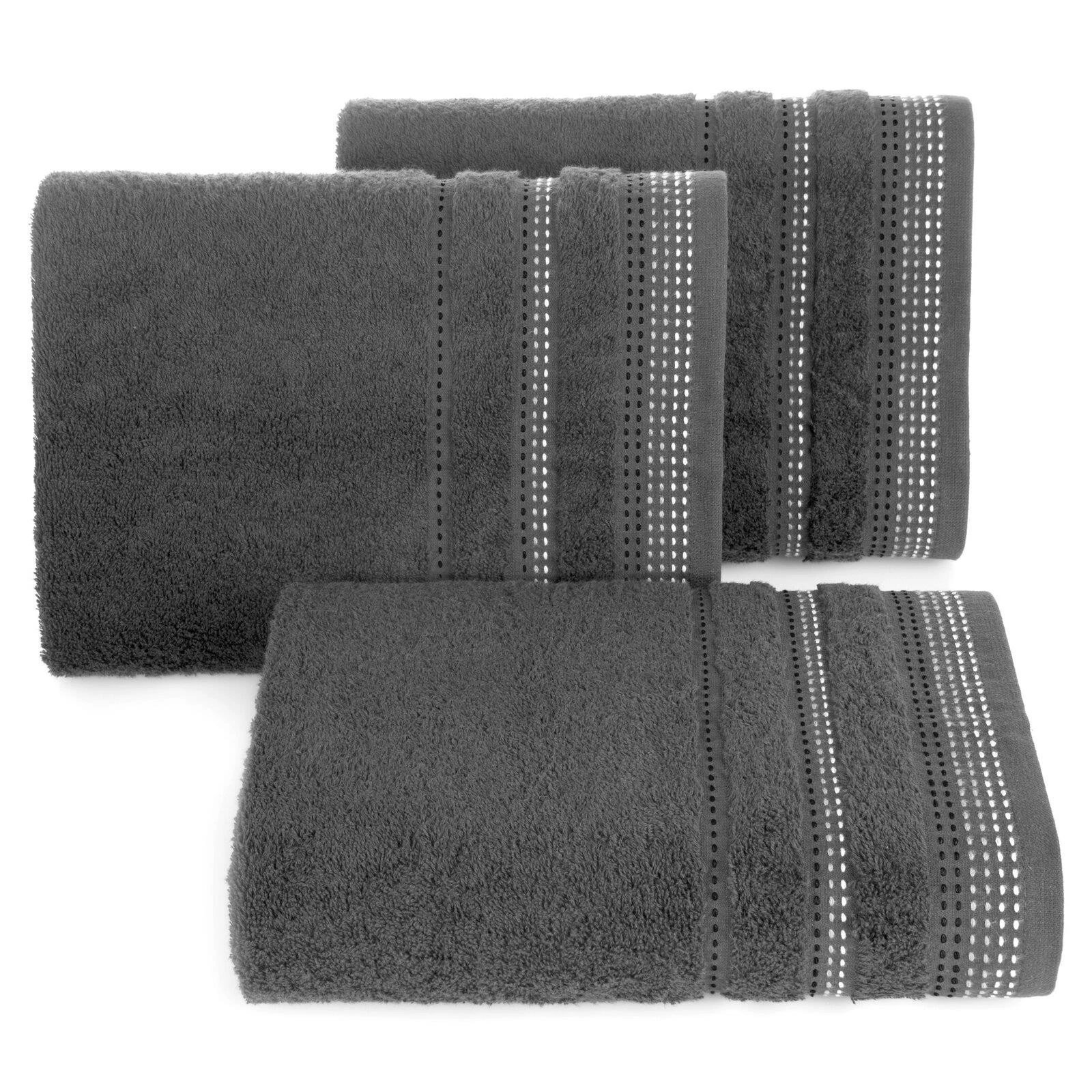 Jednobarwny ręcznik z miękkiej i chłonnej tkaniny bawełnianej o splocie frotte zdobiony kolorową bordiurą w stylu fastrygi. Łatwy w praniu, nie farbuje. szerokość: 30 cm, długość: 50 cm, kolor: stalowy, Gramatura: 500 GSM, Skład: 100% bawełna