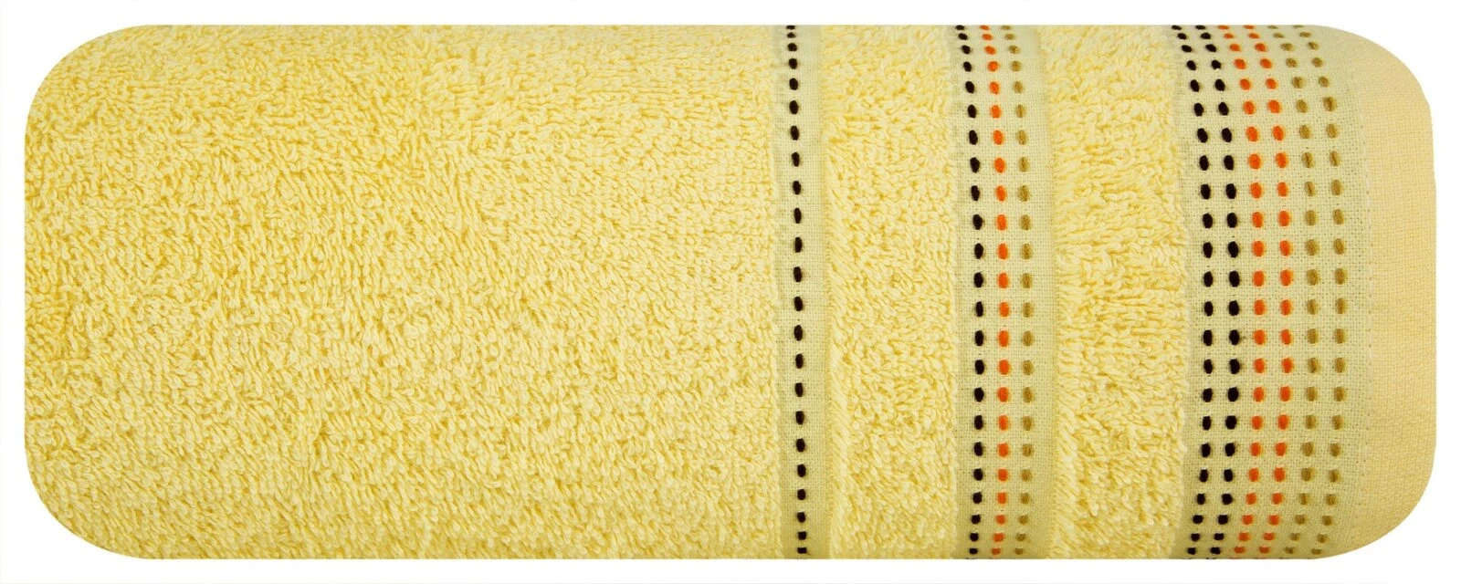 Jednobarwny ręcznik z miękkiej i chłonnej tkaniny bawełnianej o splocie frotte zdobiony kolorową bordiurą w stylu fastrygi. Łatwy w praniu, nie farbuje. szerokość: 30 cm, długość: 50 cm, kolor: żółty, Gramatura: 500 GSM, Skład: 100% bawełna